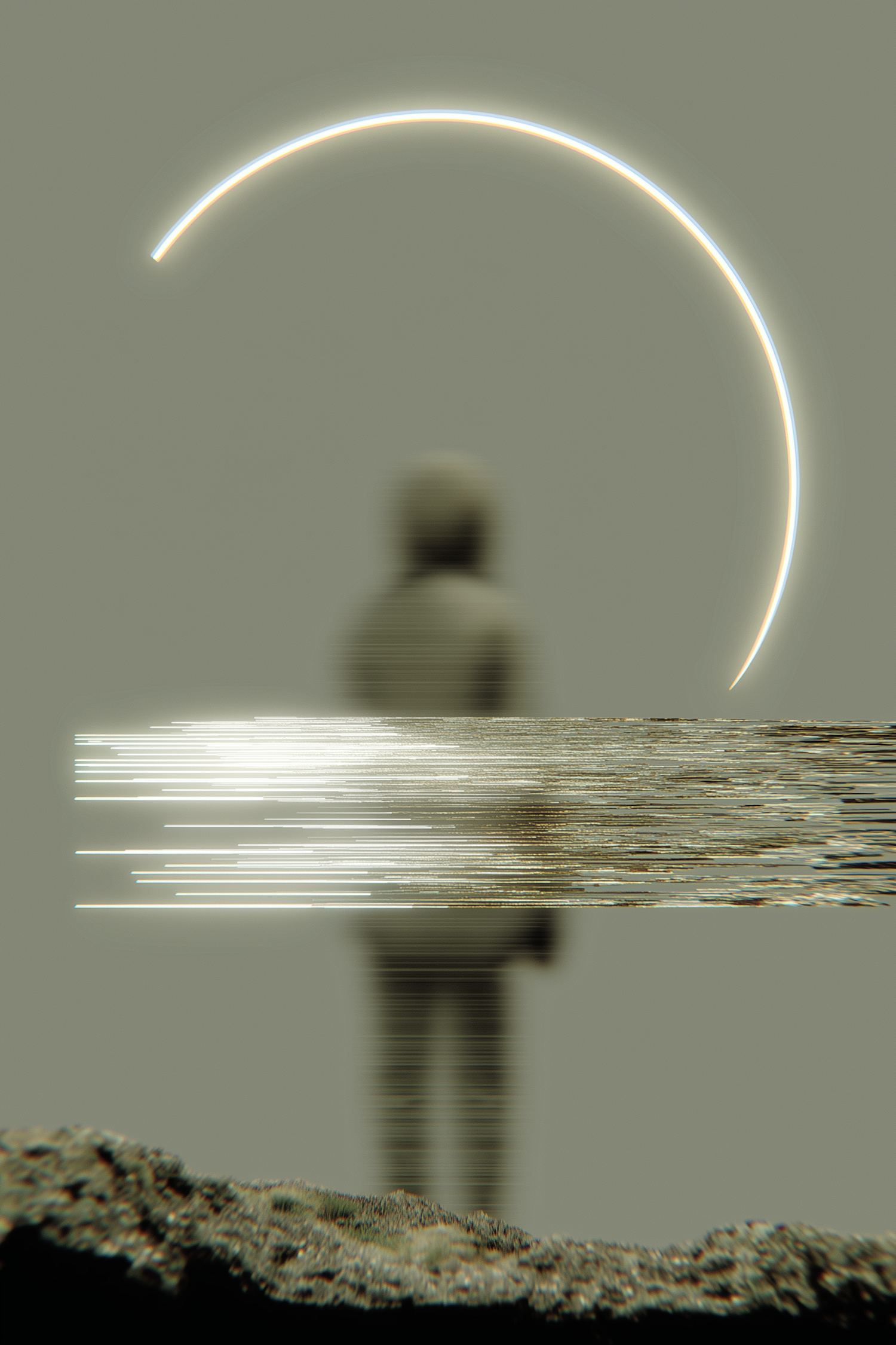 A surreal digital artwork with a glowing arc, glitch effects, and a blurred figure, creating a mysterious and futuristic atmosphere.