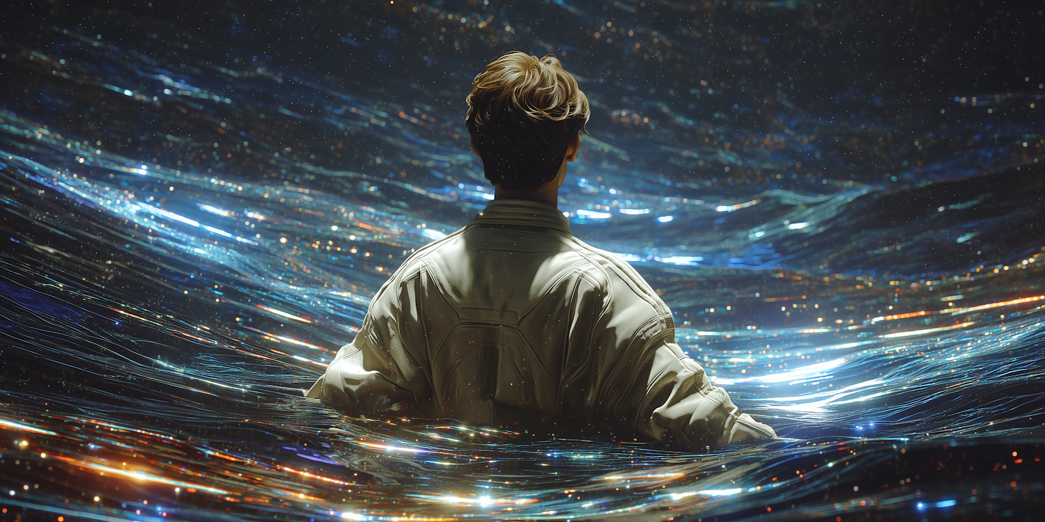 A person in a luminous, surreal environment surrounded by flowing, glowing streaks of light in blue and gold hues.