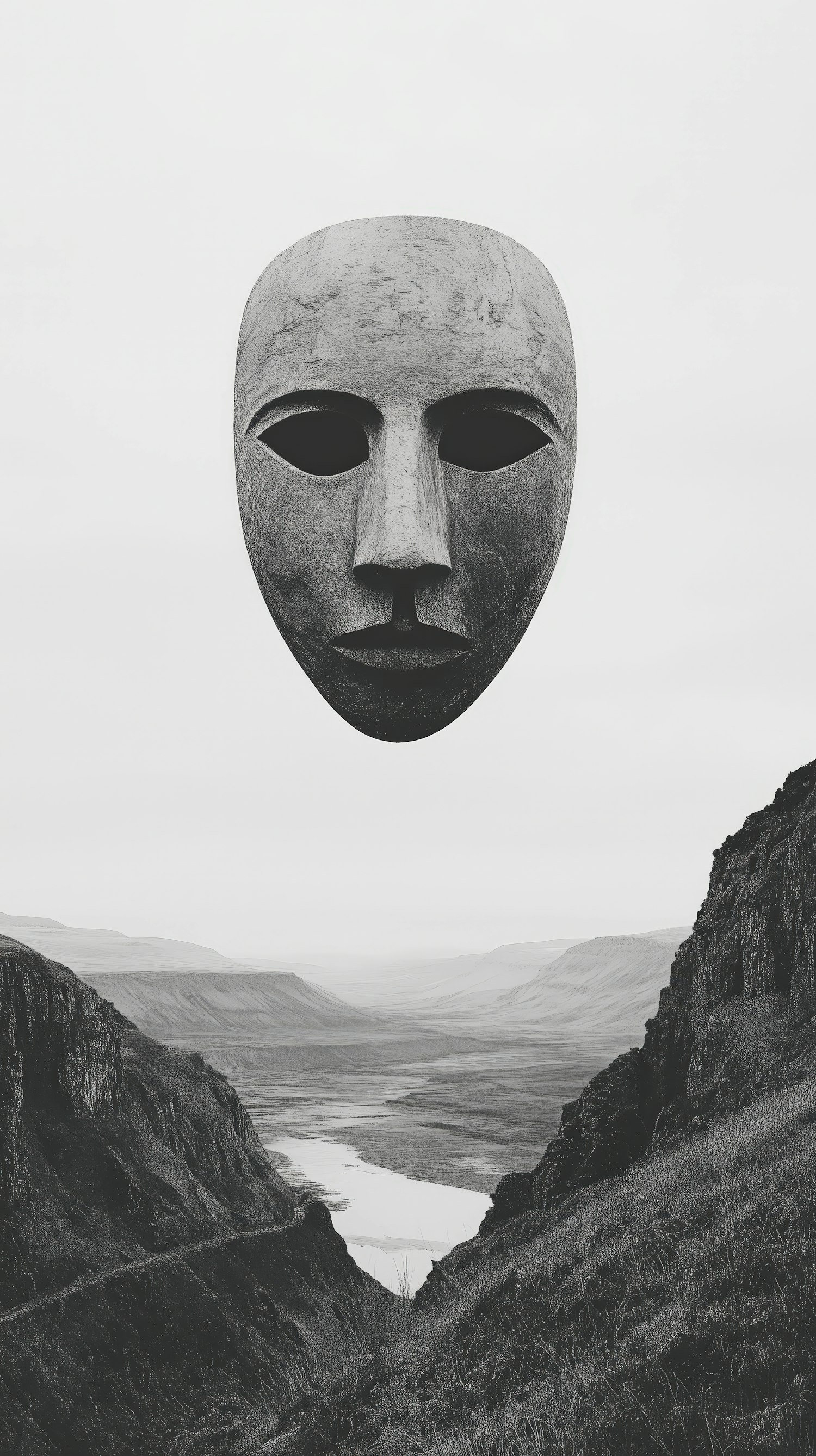A surreal black-and-white image of a floating stone mask over a dramatic canyon landscape with cliffs and a winding river.