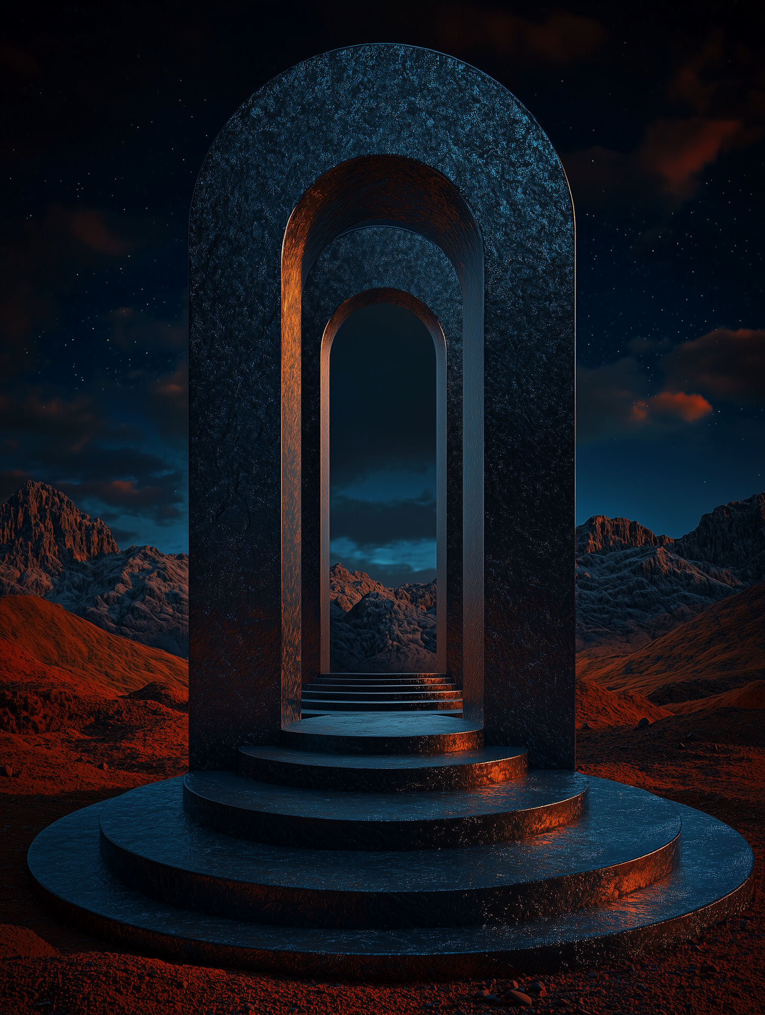 A surreal metallic archway on a tiered platform, set in a red rocky alien landscape under a starry night sky.
