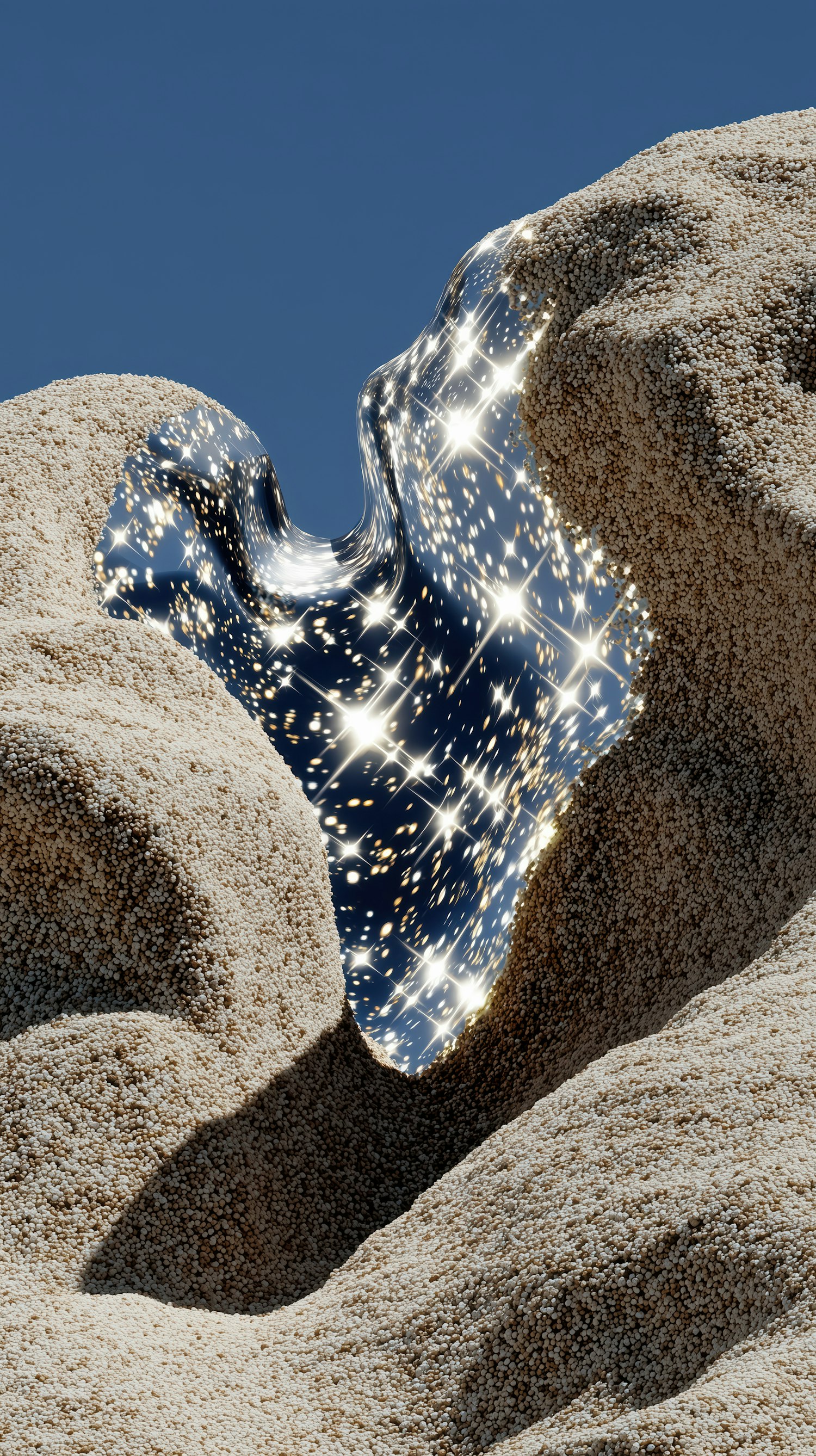 Surreal image of textured dunes with a reflective, liquid-like metallic surface sparkling under a clear blue sky.