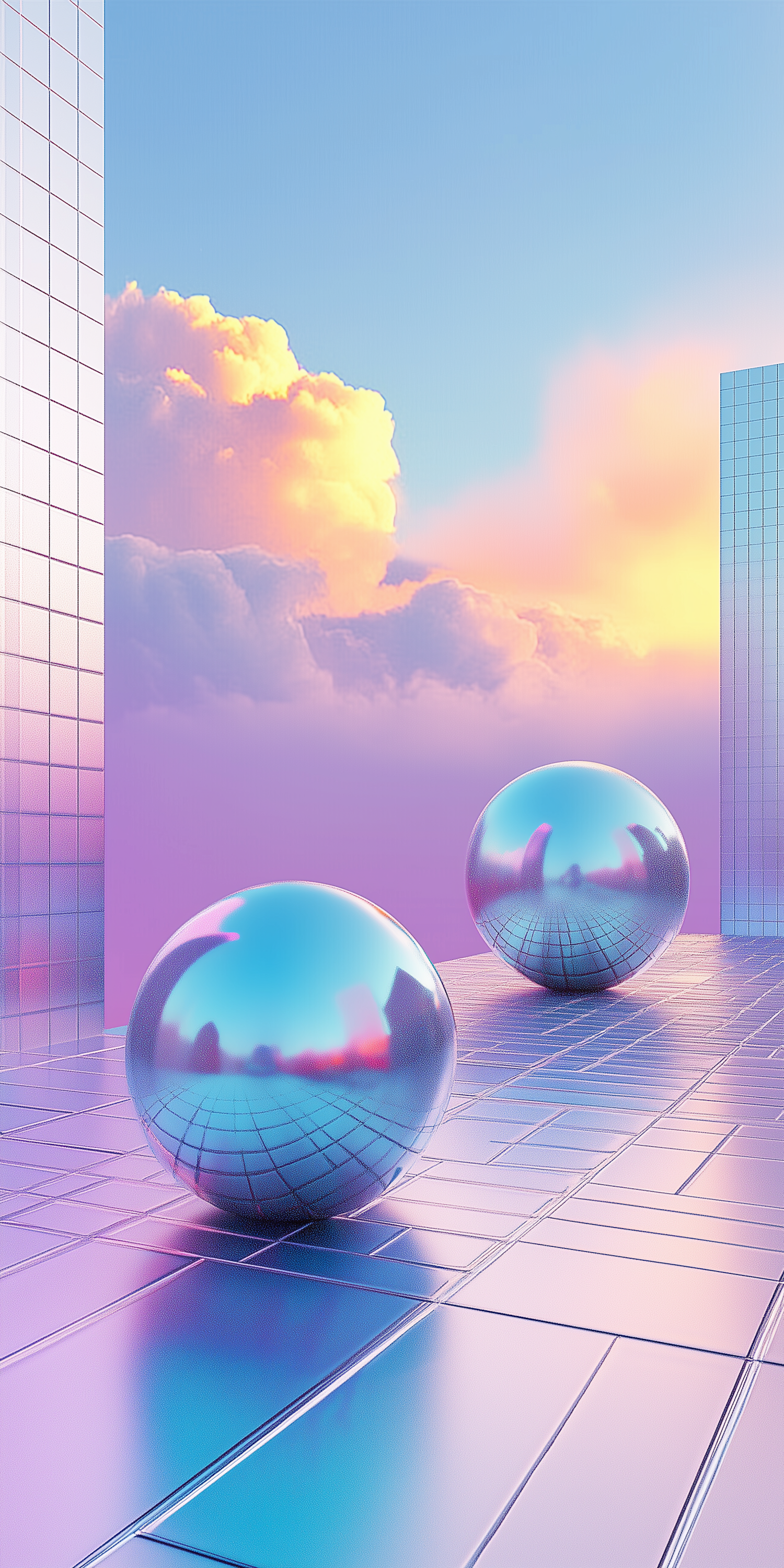 Dreamy digital art with reflective spheres, pastel tiles, and a vibrant sky of golden clouds and futuristic structures.