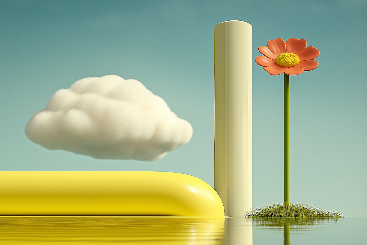 A surreal digital artwork with a fluffy cloud, yellow shapes, and an orange flower on a reflective surface under a clear sky.