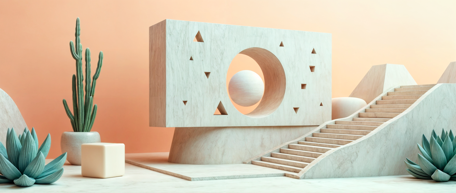Surreal architectural scene with geometric shapes, a central sphere, and desert plants against a peach gradient background.