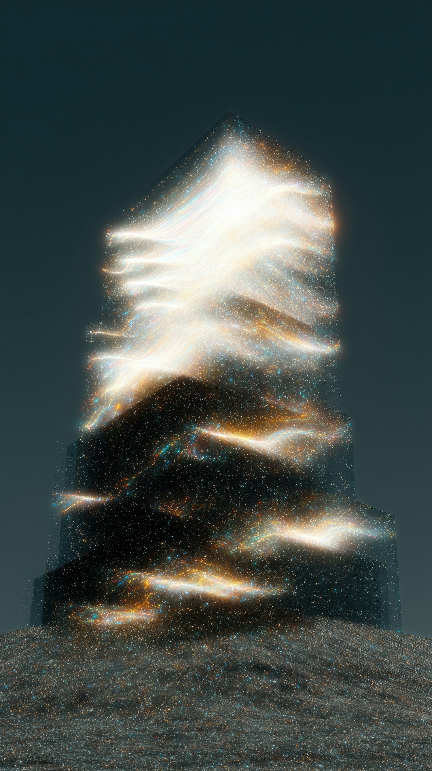 A surreal monolithic structure with swirling, colorful light trails in a barren landscape under a dark sky. Ethereal and mysterious.