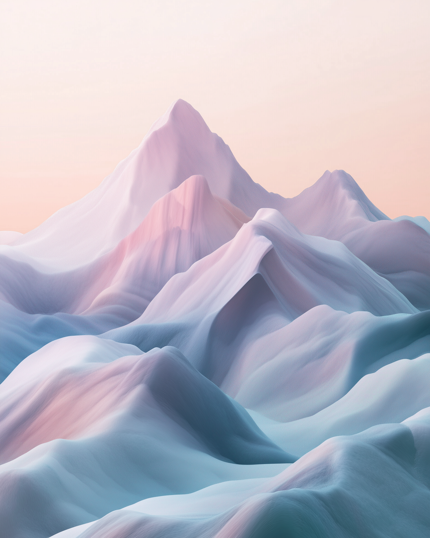 Dreamy pastel mountain range with soft pink, blue, and lavender hues, creating a surreal and tranquil abstract landscape.