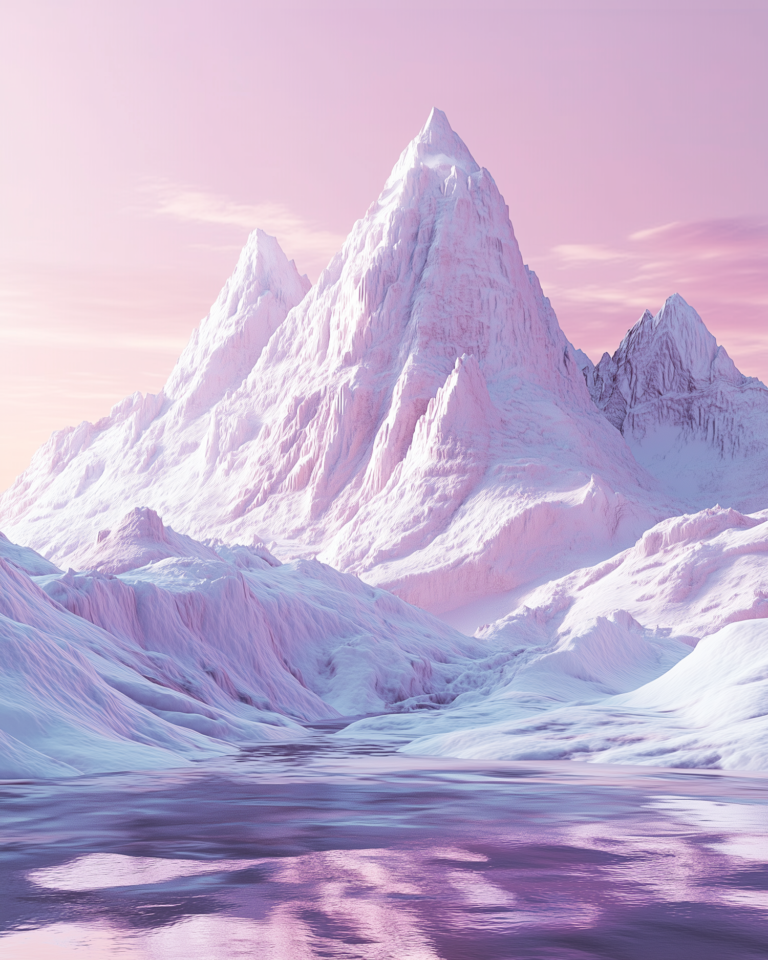 Dreamy snow-covered mountains in soft pink hues with a reflective lake and pastel sky, creating a serene and surreal landscape.