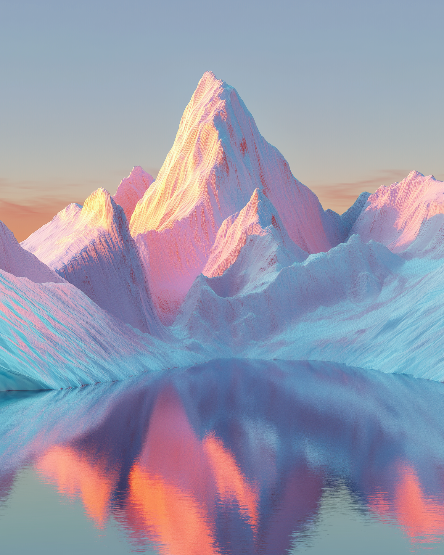 Dreamy pastel mountain peaks reflected in a serene lake, with soft hues of pink, orange, and blue under a tranquil sky.