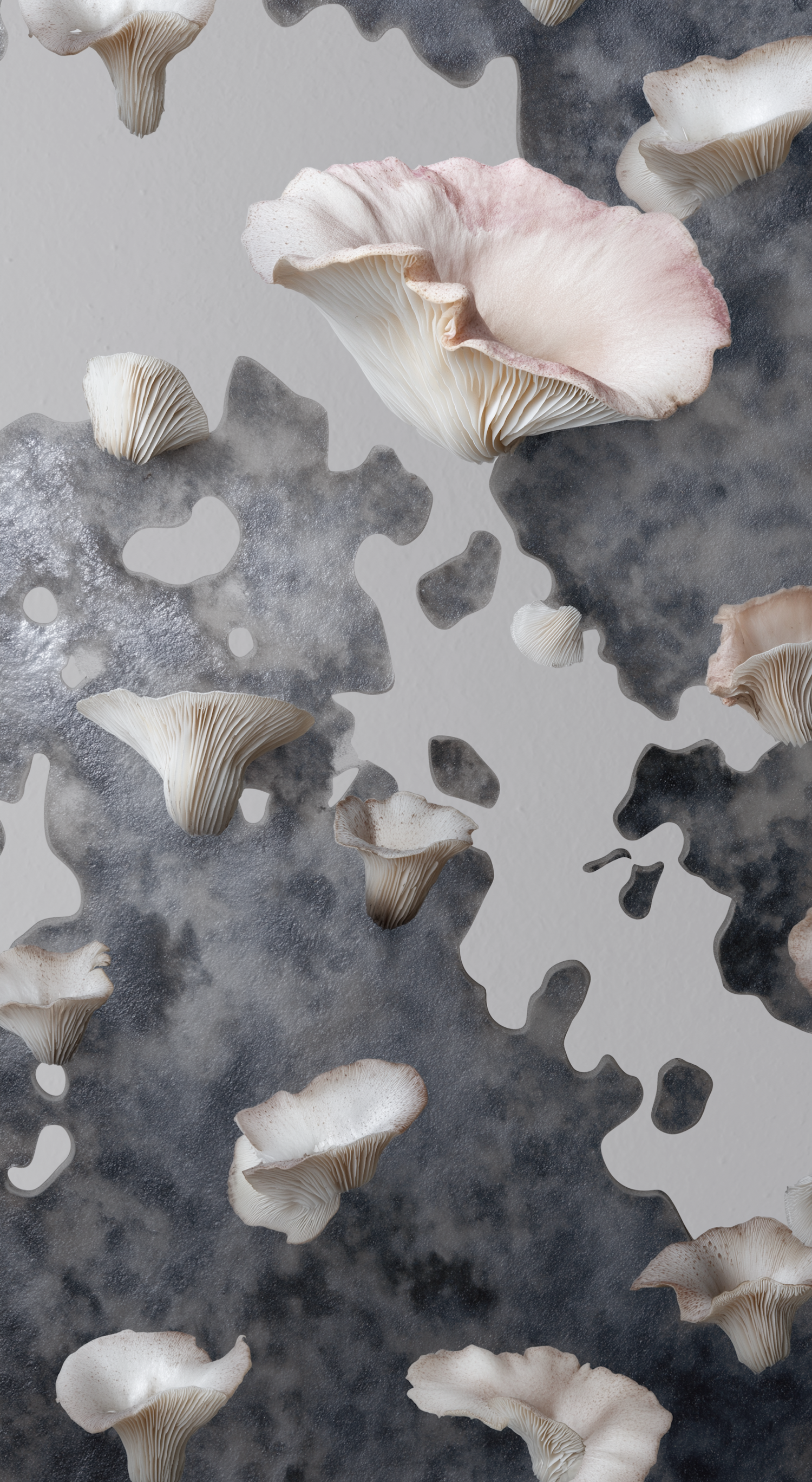 A surreal depiction of delicate mushrooms against a textured, abstract background, showcasing organic forms and intricate details.