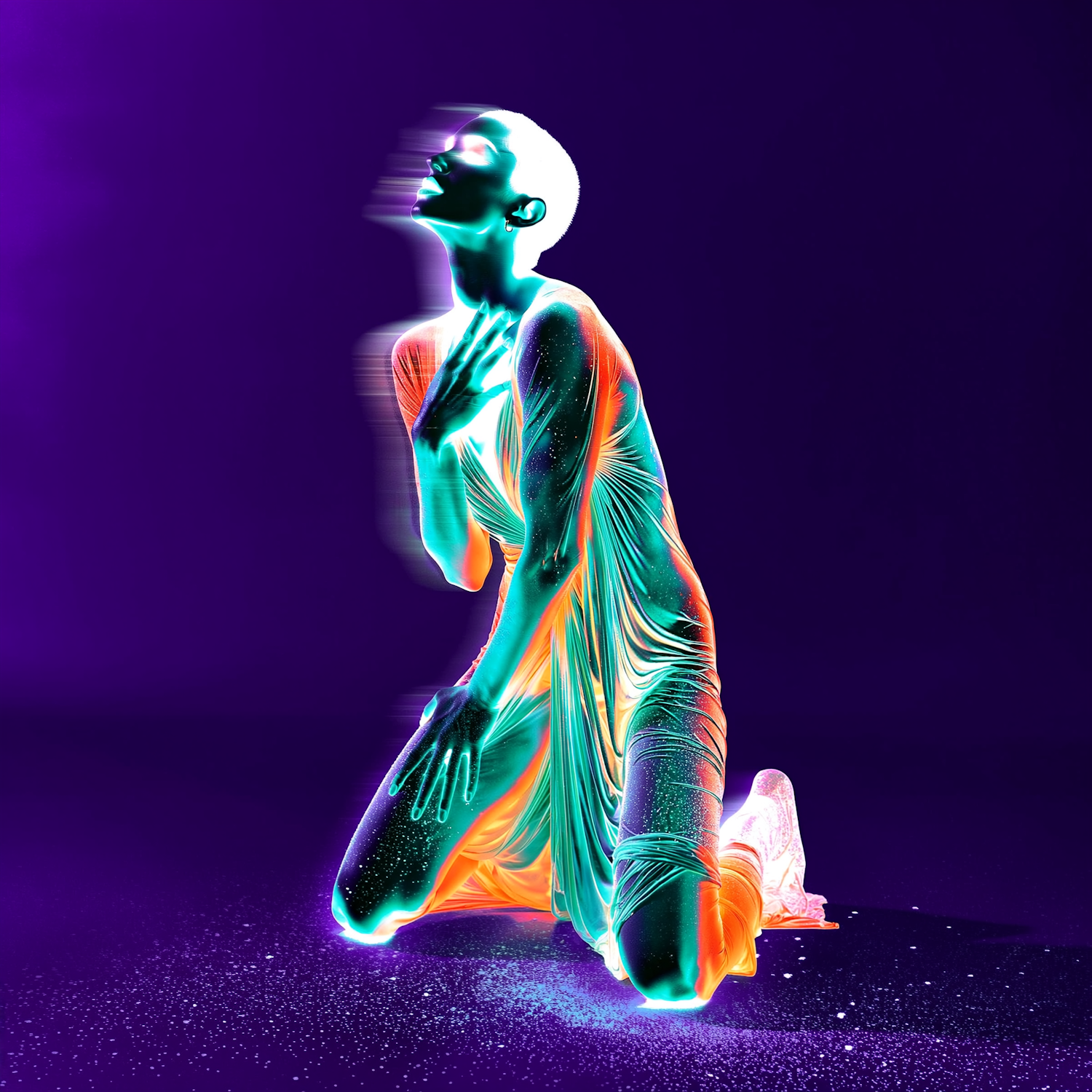 A neon-lit figure kneels in a surreal pose, glowing in vibrant colors against a deep purple background, evoking a dreamlike atmosphere.