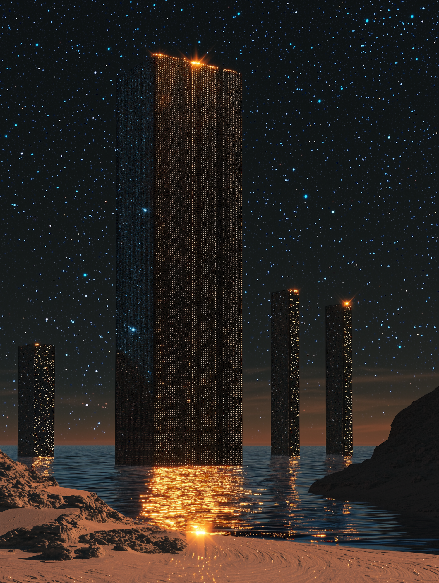 Towering monoliths with glowing lights rise from water under a starry sky, creating a surreal and futuristic nighttime scene.