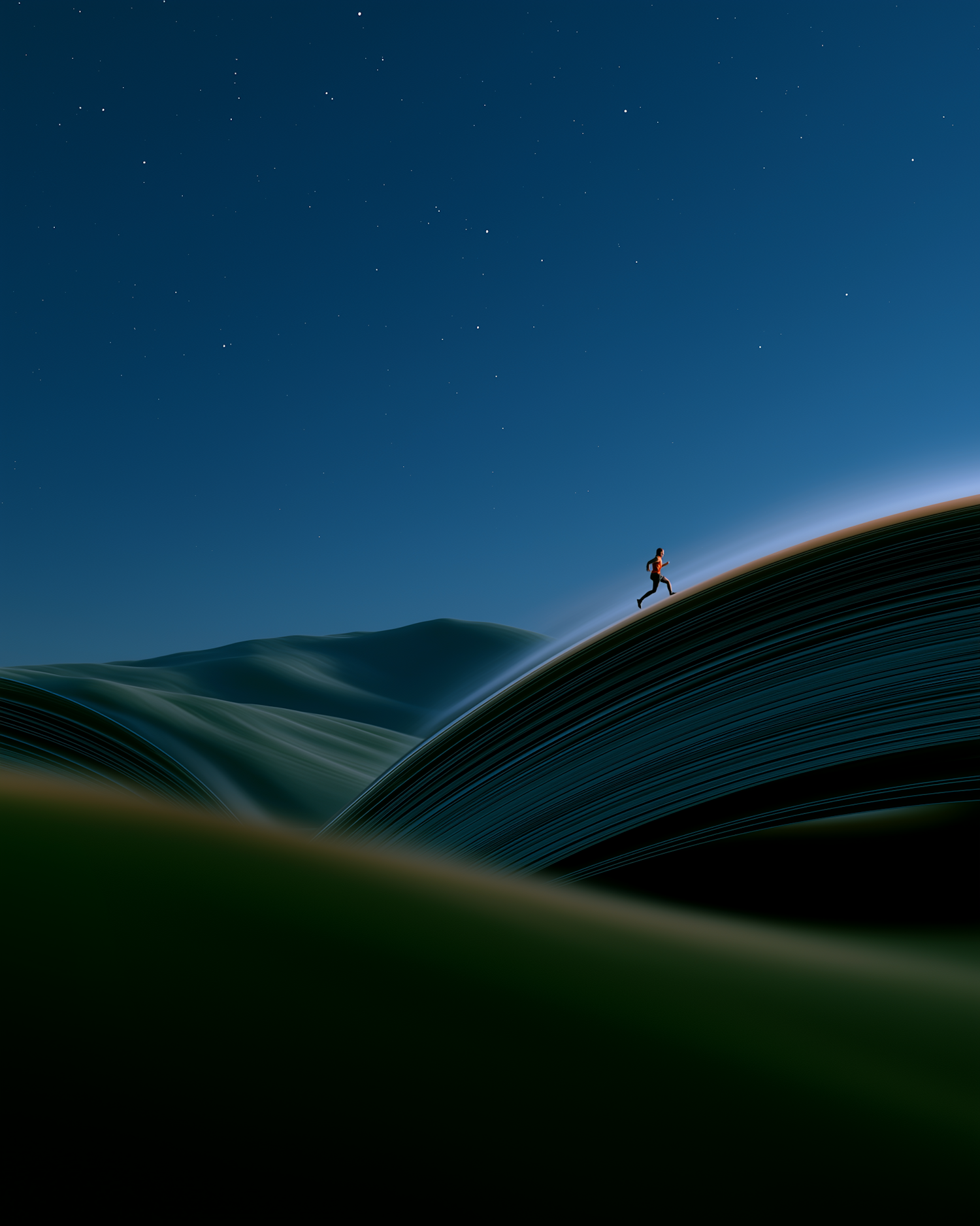 A lone runner traverses a surreal, flowing landscape under a starry night sky, blending motion and tranquility in a dreamlike setting.