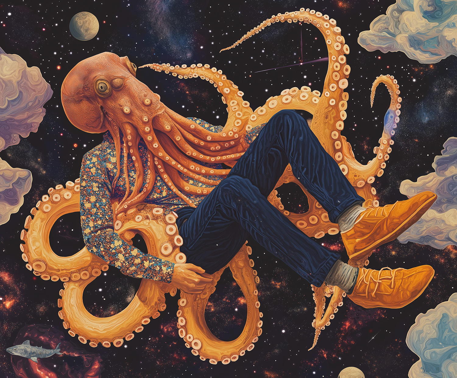 Surreal illustration of a humanoid with an octopus head floating in space, wearing a floral shirt and orange shoes, against a starry backdrop.