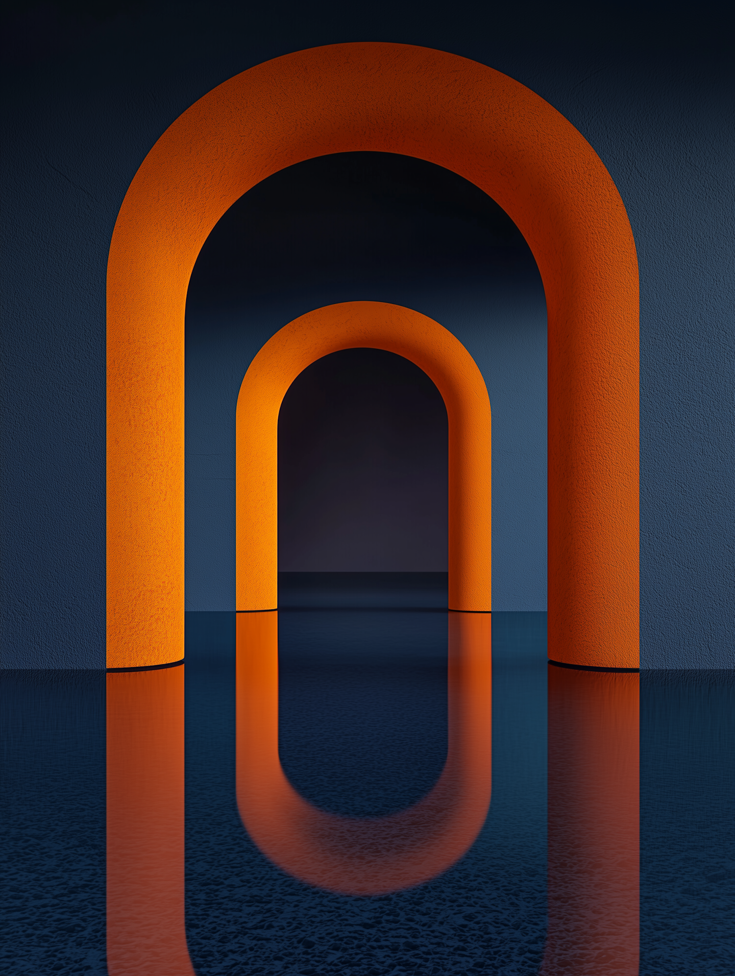 A surreal scene of glowing orange arches reflected on a calm water surface, set against a dark blue background. Minimalist and striking.