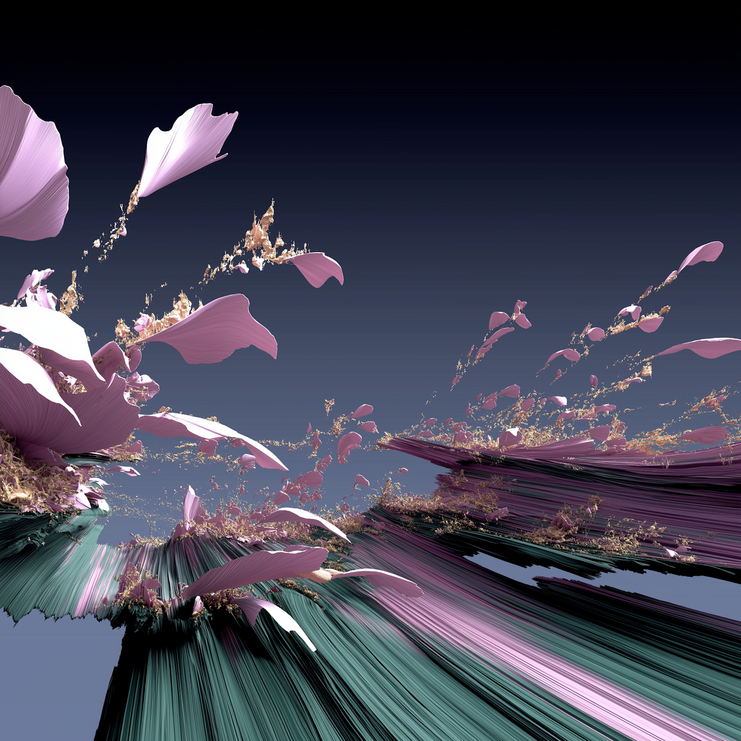 Abstract digital artwork with flowing pink and green shapes against a deep blue background, evoking a surreal and dynamic landscape.