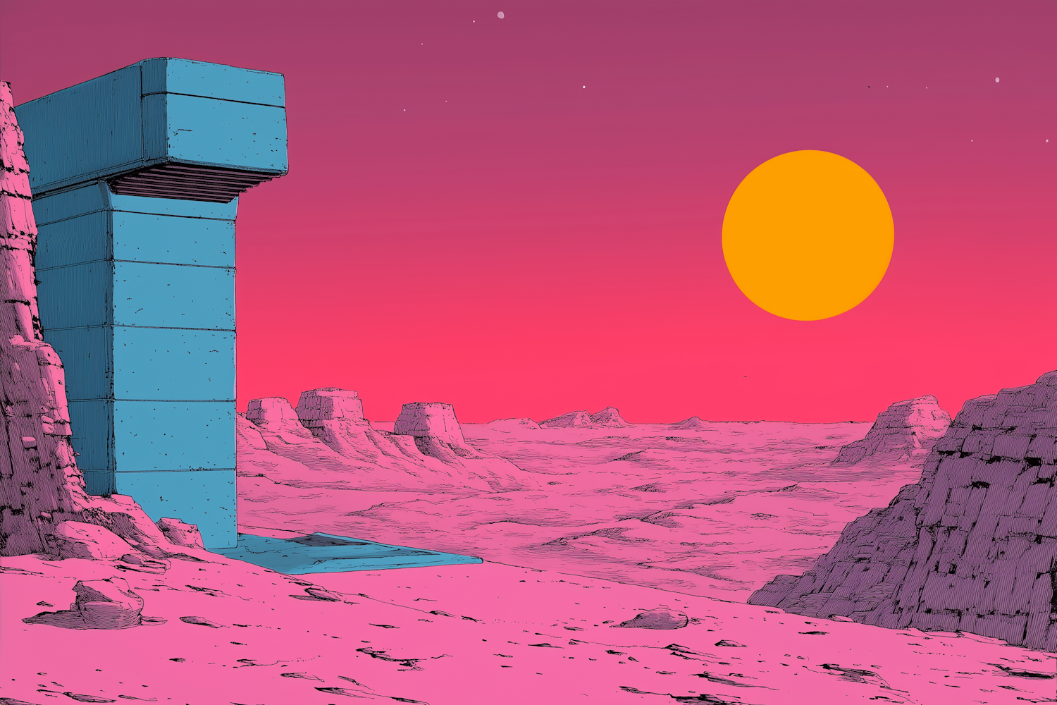 Surreal landscape with a blue structure, pink desert, and orange sun, creating a dreamlike, futuristic atmosphere.