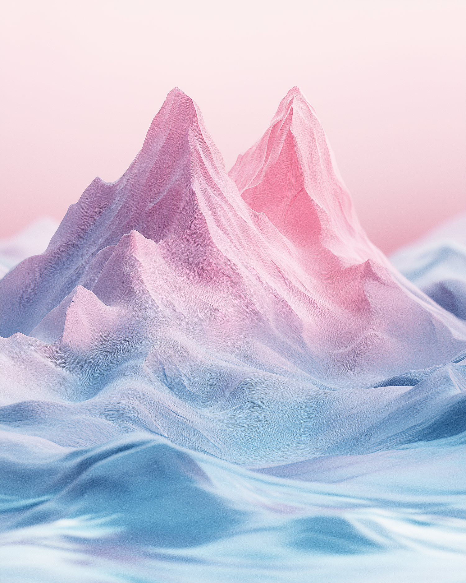 Dreamy pastel 3D-rendered mountains with smooth textures and soft pink and blue hues, set against a gradient sky.