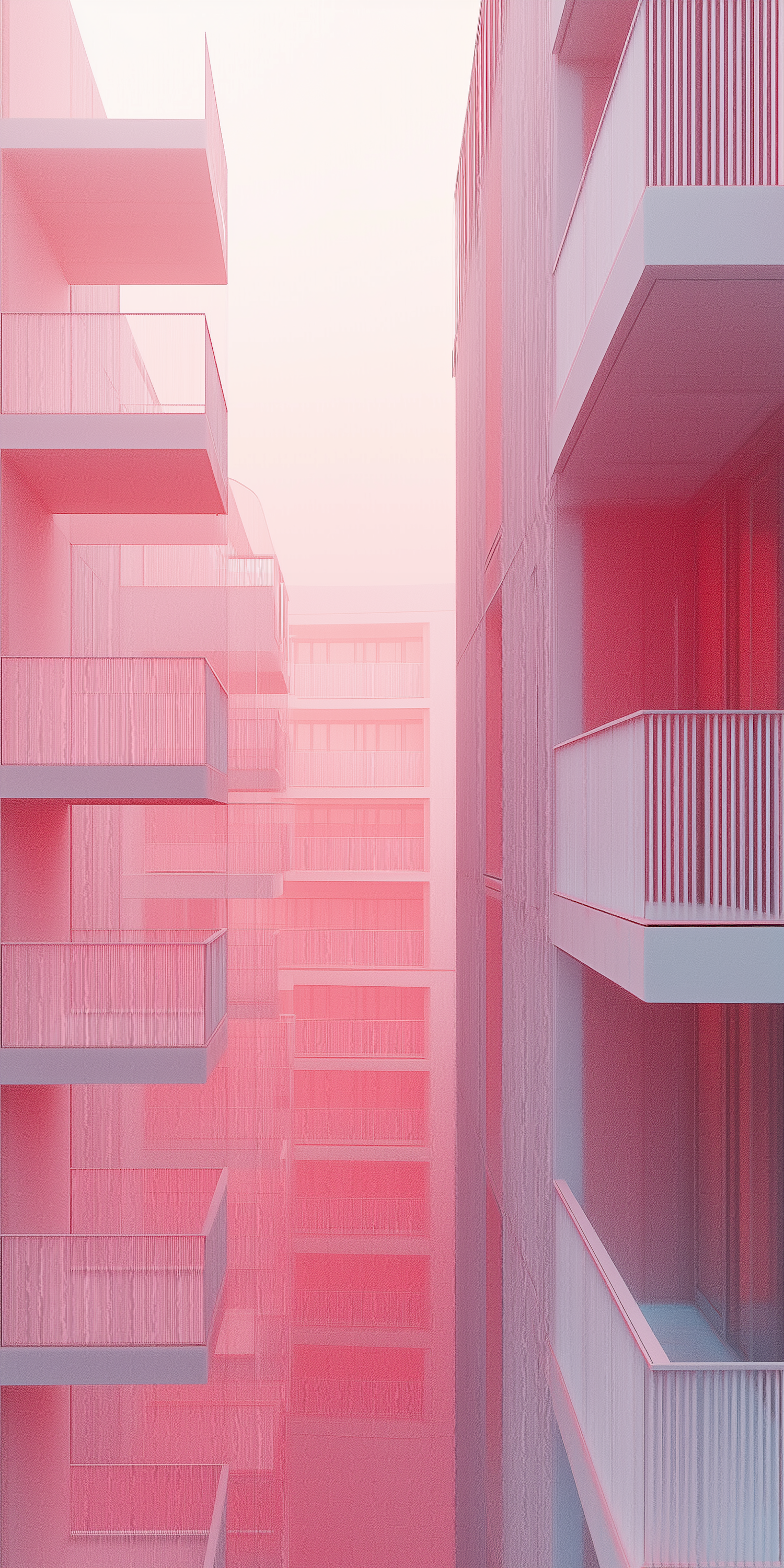 Modern pink-hued apartment buildings with clean lines and white balconies, creating a dreamy, minimalist architectural vibe.