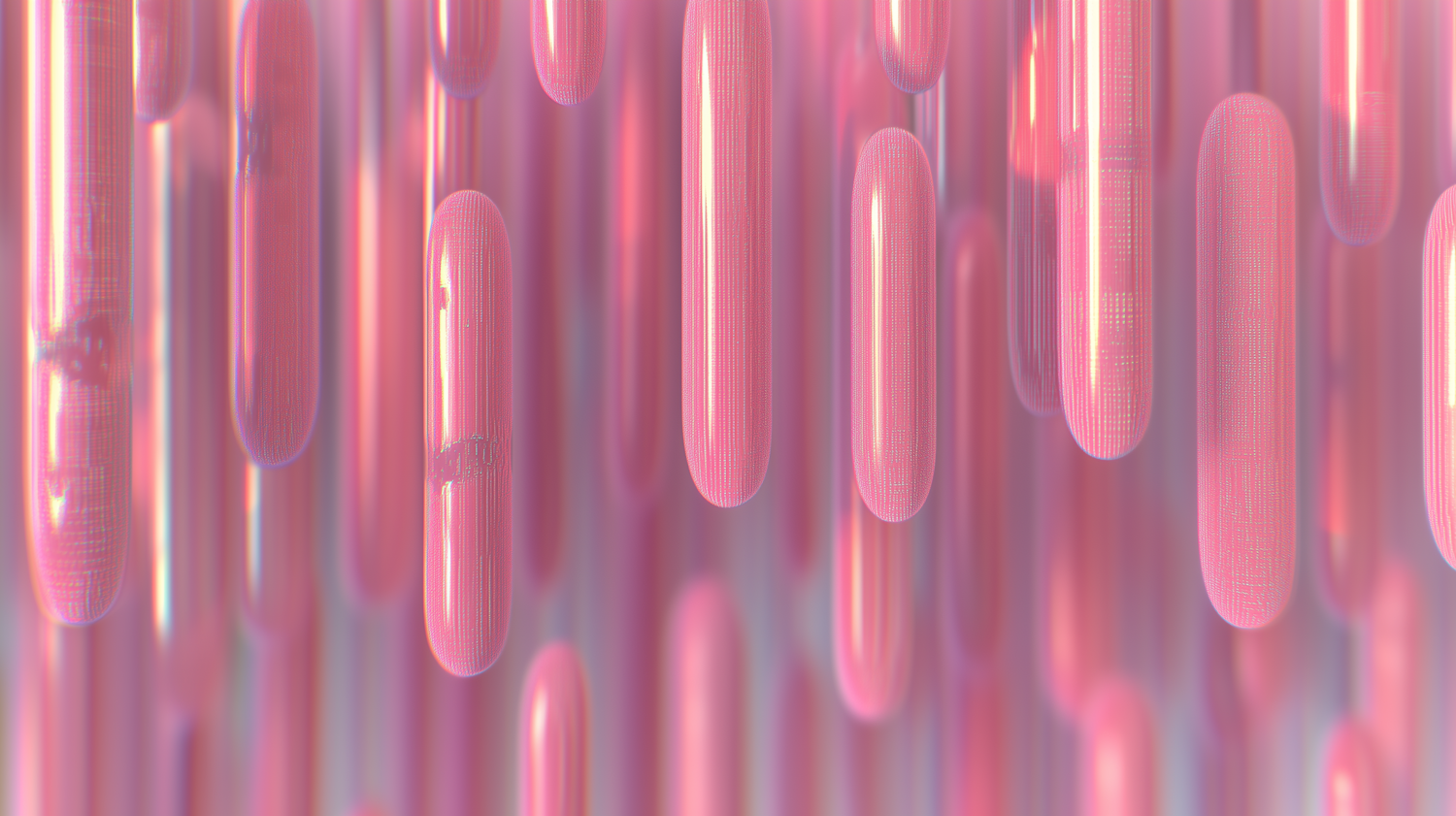 Abstract pink capsules suspended in a dreamy, futuristic setting with soft lighting and blurred pink-purple hues in the background.