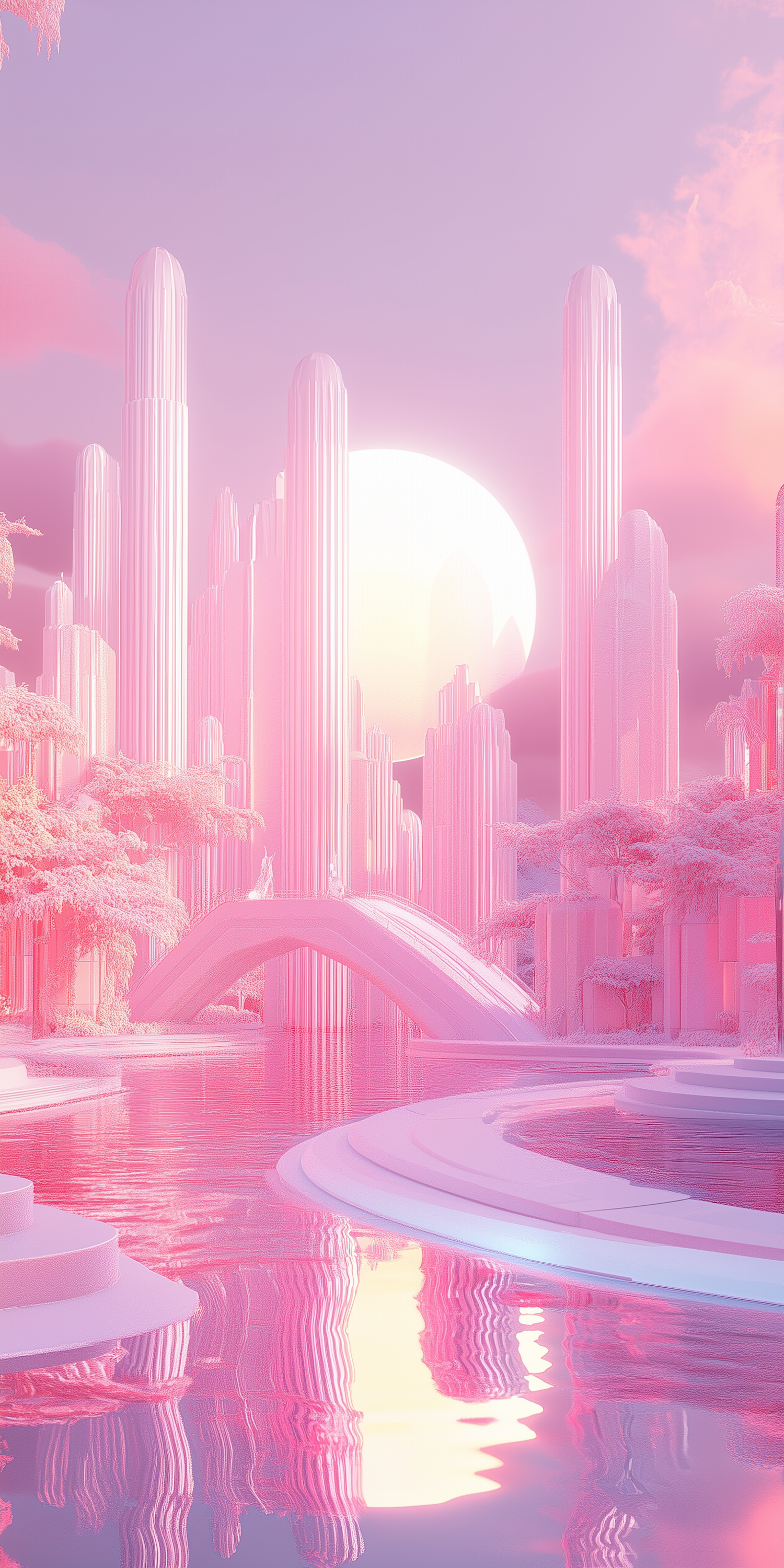 A dreamy pink cityscape with glowing skyscrapers, a serene bridge, and a massive sun reflecting on calm waters. Futuristic and surreal.