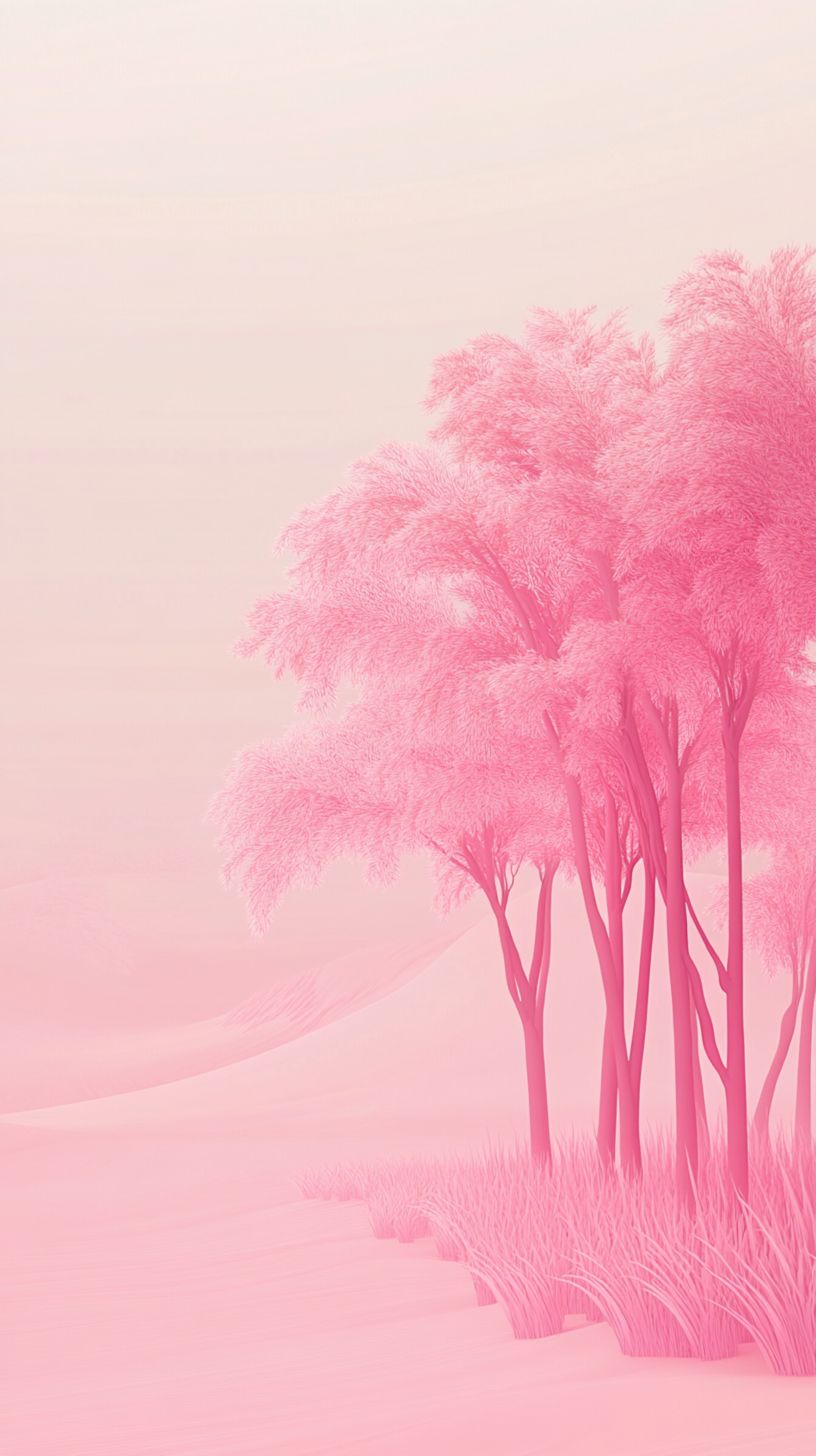 A dreamy pink landscape with fluffy trees, soft grass, and a hazy pastel sky, creating a surreal and tranquil atmosphere.