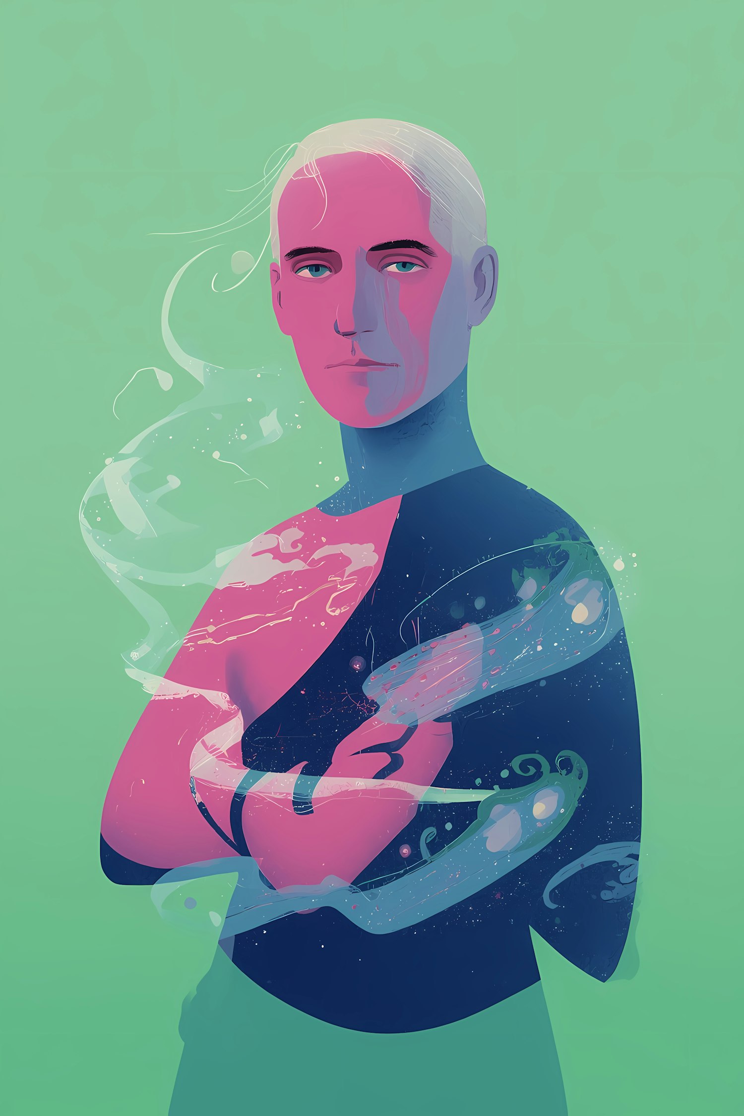 Stylized illustration of a person with vibrant colors and abstract patterns, blending surreal elements with a modern artistic touch.