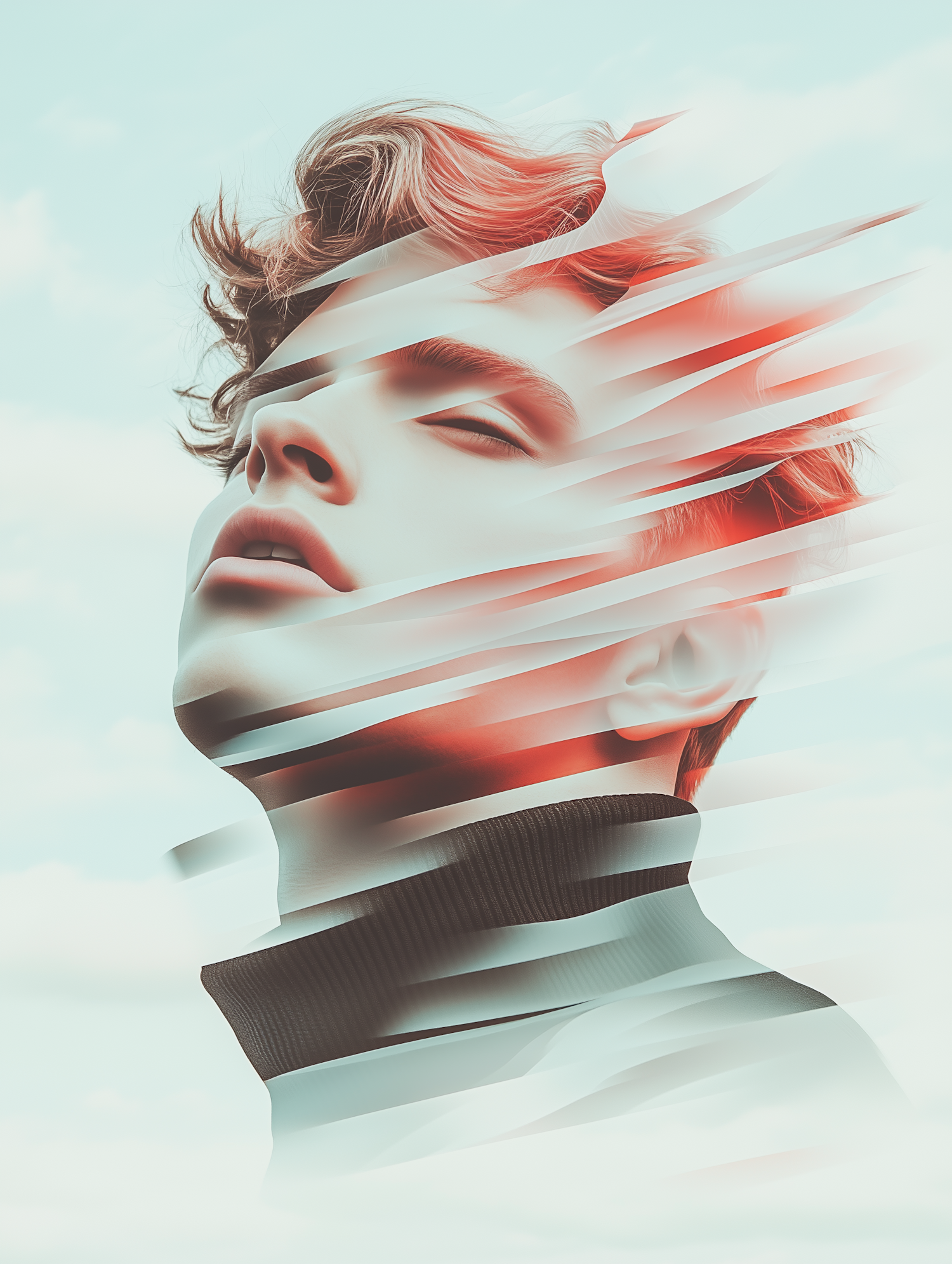 Surreal digital art of a serene face with fragmented streaks, set against a pastel sky. A mix of calm and dynamic energy.