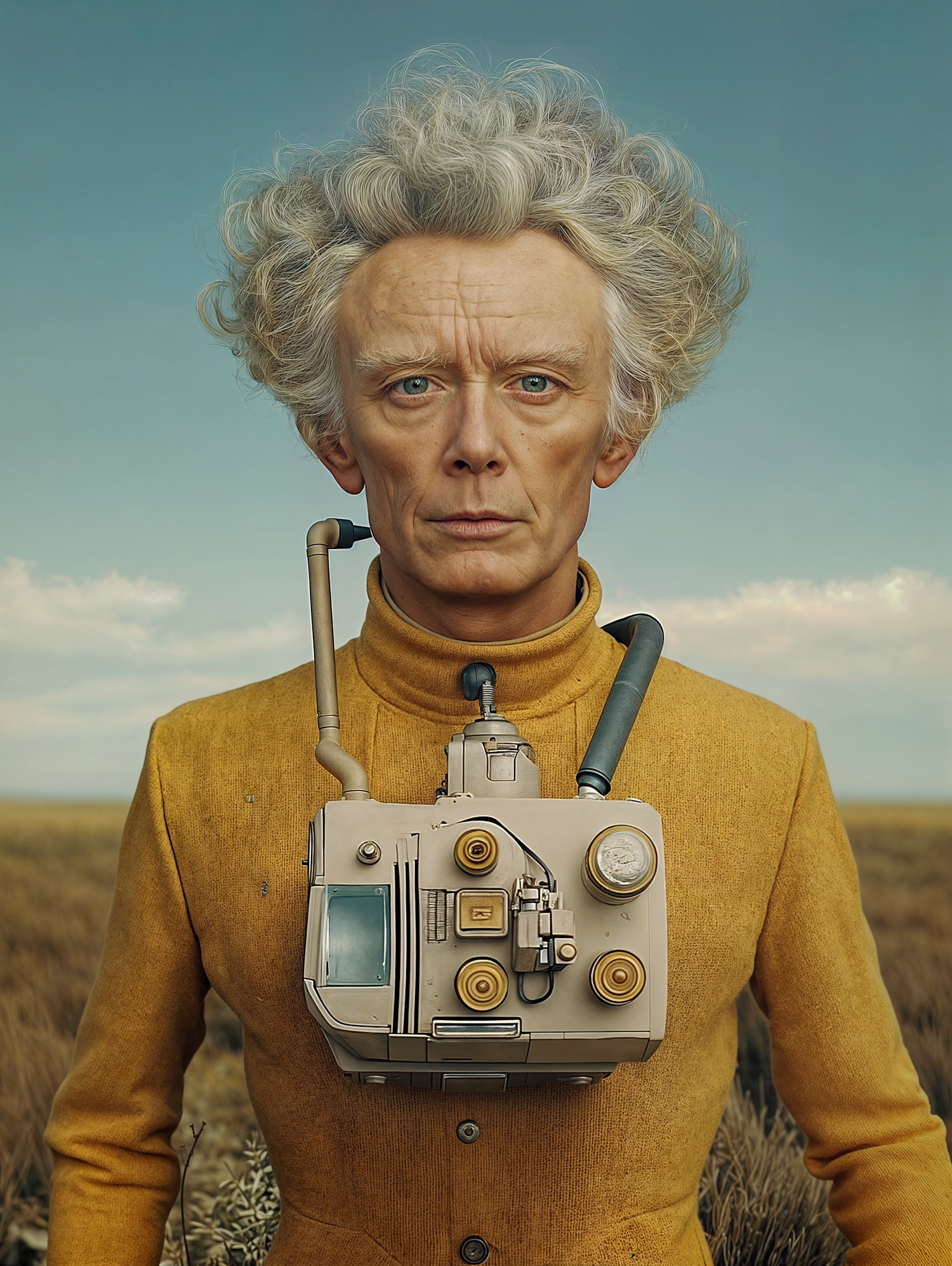 A surreal portrait of a man with gray hair, a yellow jacket, and a retro-futuristic device on his chest, set in a grassy field.
