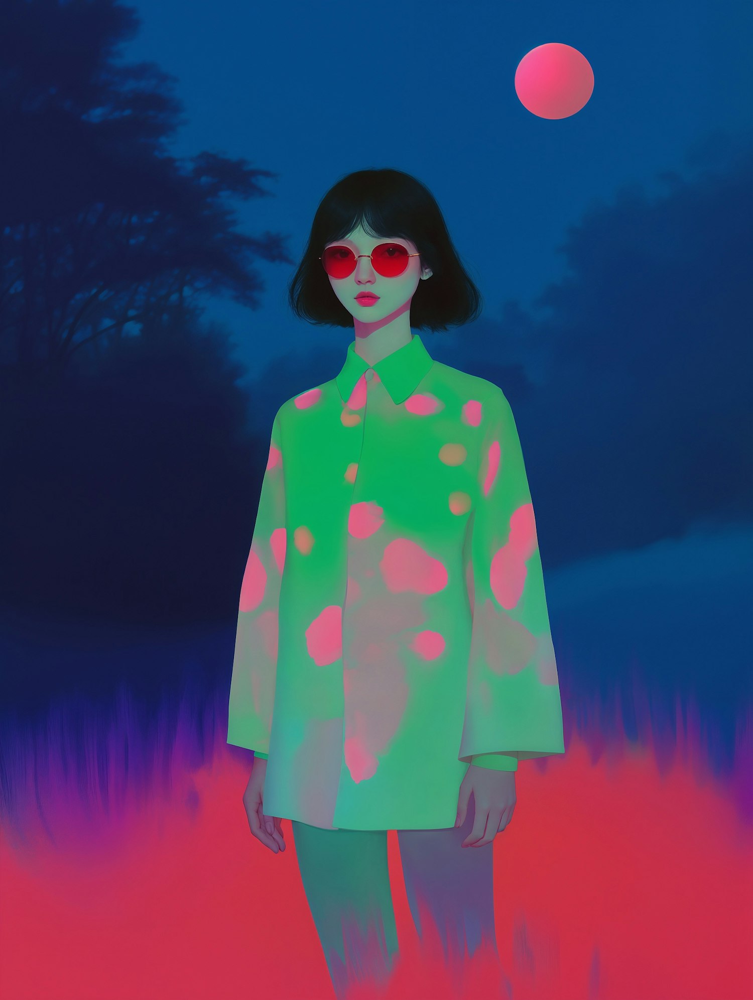 Surreal illustration of a person in vibrant attire with red sunglasses, set against a dreamy, colorful landscape with a pink moon.