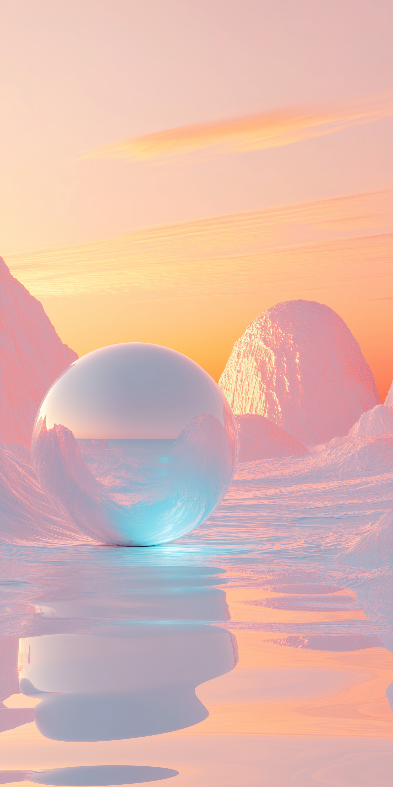 A dreamy digital artwork of a reflective sphere on icy terrain, surrounded by pastel snow hills and a glowing pink-orange sky.