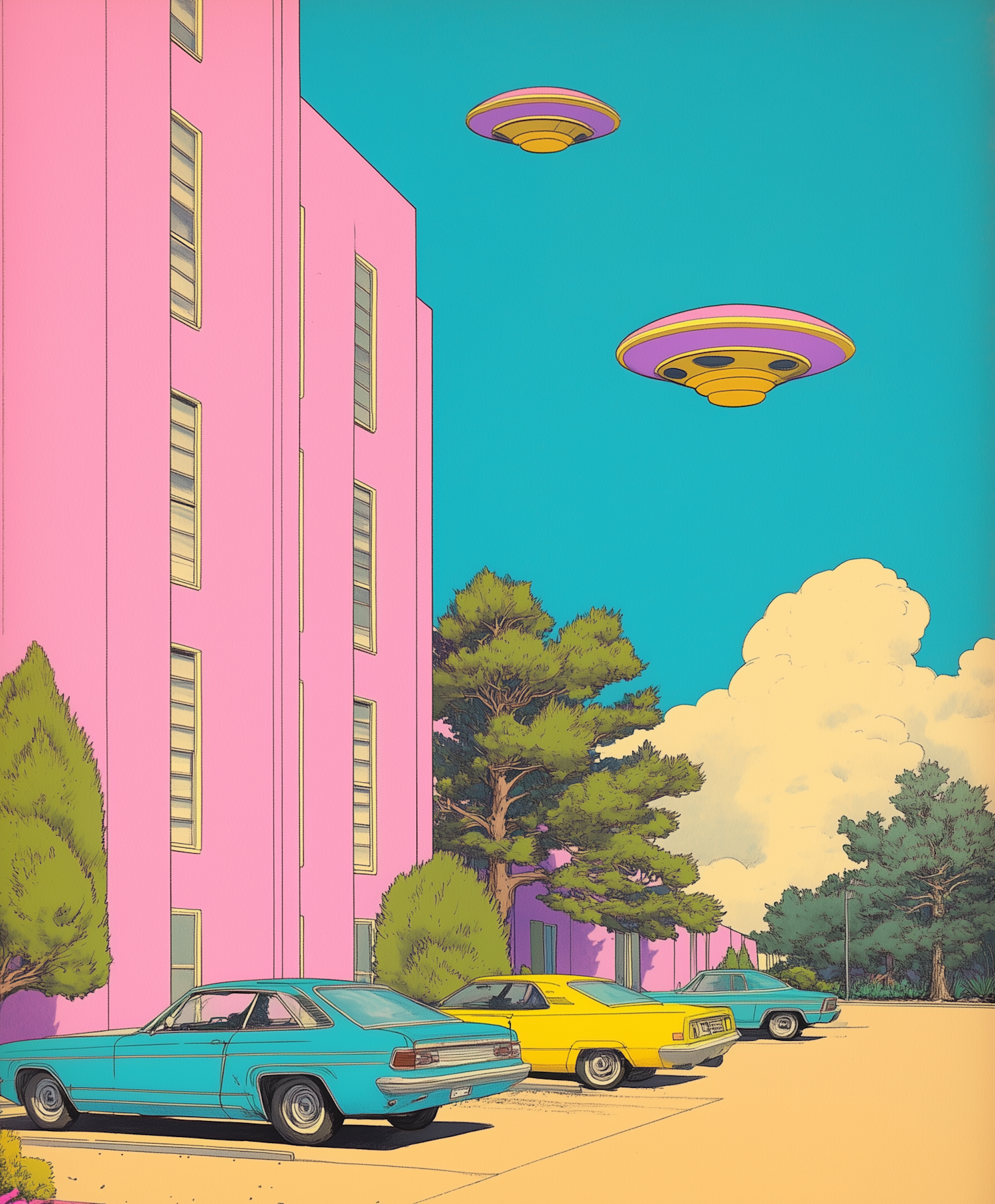 Surreal illustration of vintage cars parked by a pink building with UFOs in a turquoise sky, blending retro and sci-fi elements.