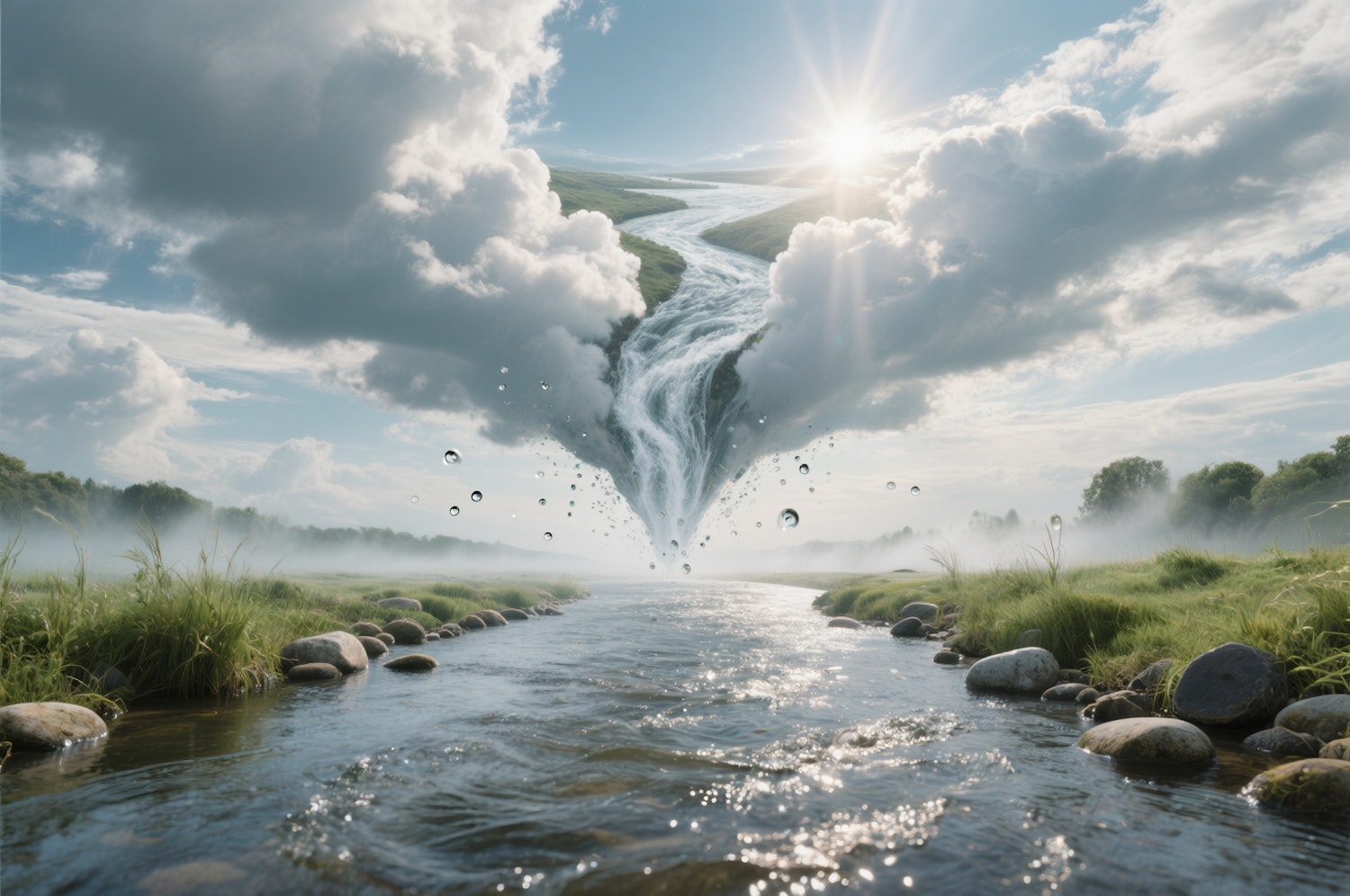 A surreal river scene where water ascends into the sky, merging with clouds in a vortex, under a bright sunlit sky.