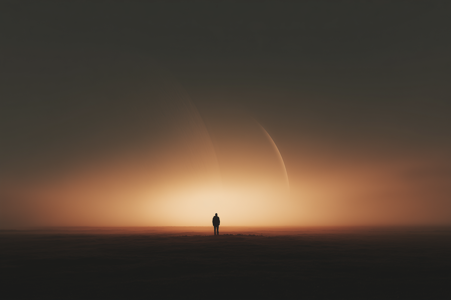 A lone figure stands on a dark plain under a glowing horizon with a massive celestial body in the background, evoking solitude and wonder.