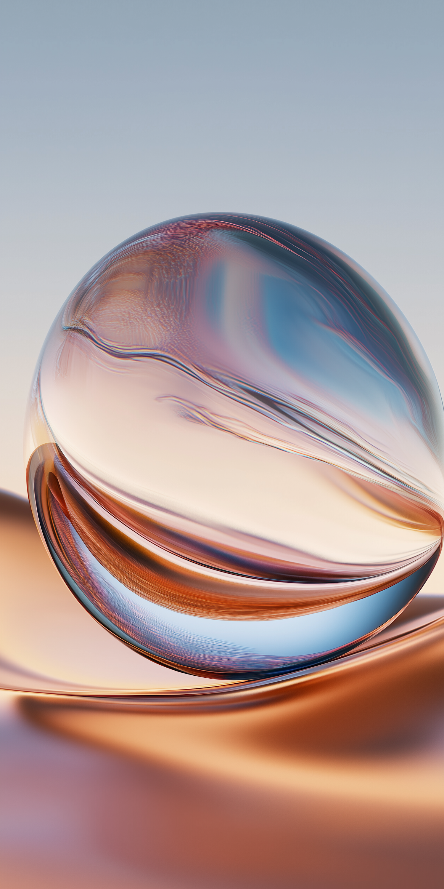 Abstract art of a glossy sphere on a fluid surface, blending warm orange and cool blue tones with a minimalist gradient background.