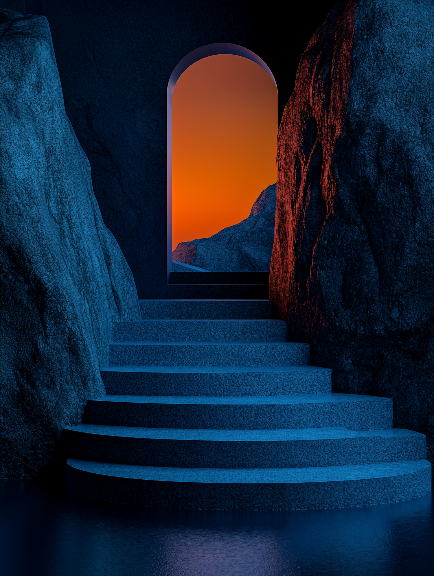 Curved blue stone steps lead to an arched doorway with a glowing orange sky, surrounded by dramatic rocky textures and surreal lighting.