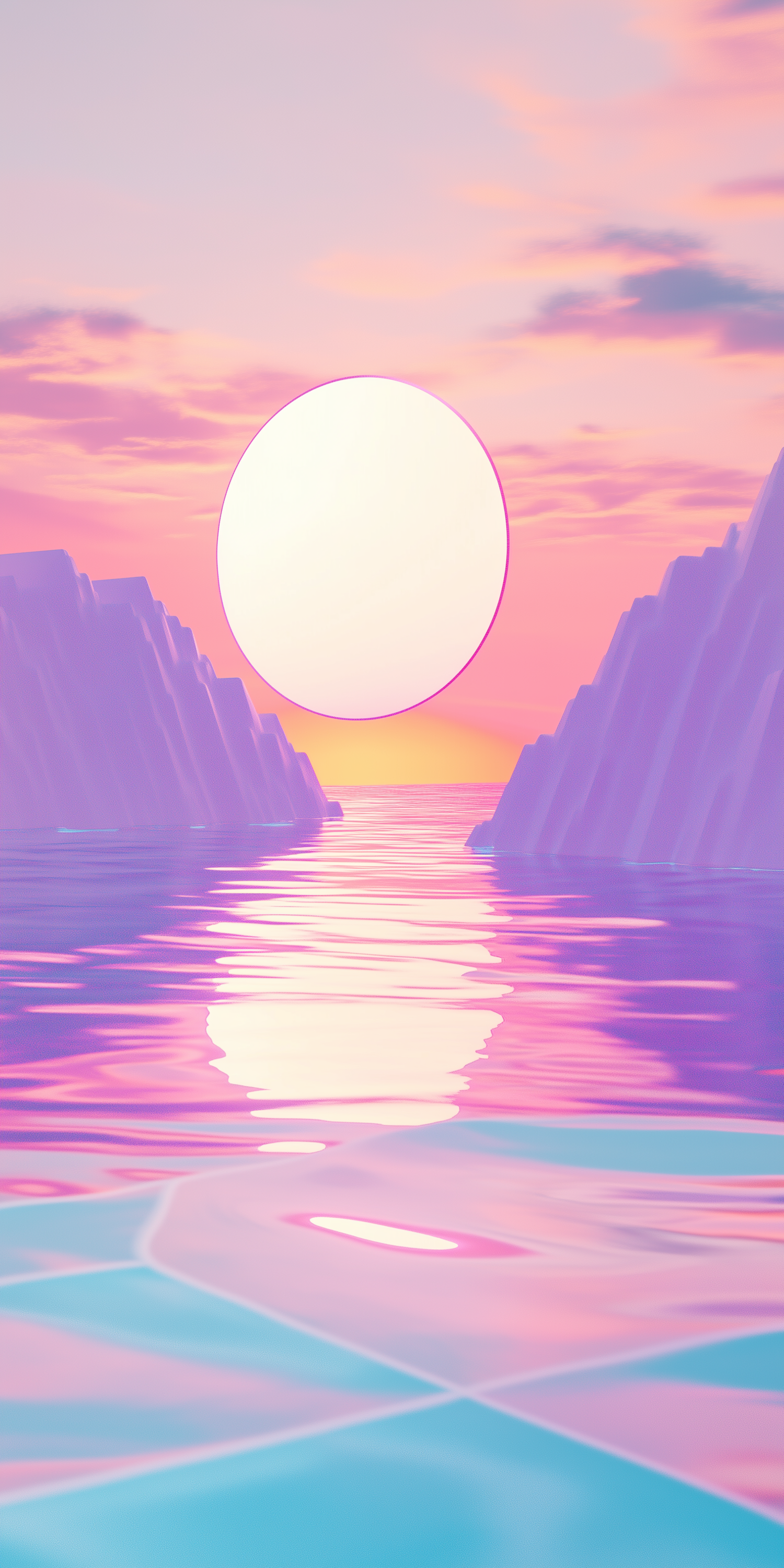 Dreamy pastel sunset with glowing sun, purple mountains, and serene water reflections in pink, orange, and blue hues.