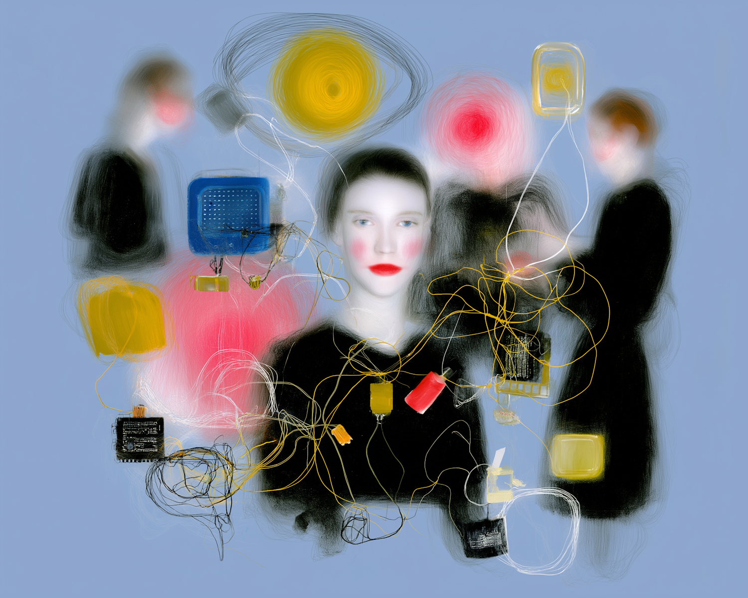 A surreal digital illustration of a central figure surrounded by abstract wires and components, blending human and technological elements.
