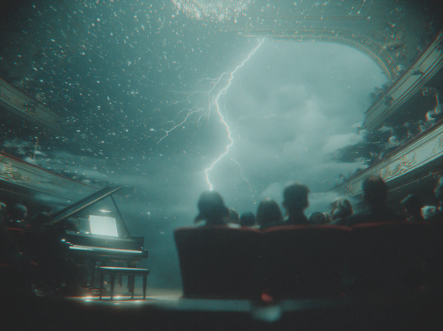 A surreal theater scene with a grand piano on stage, a stormy sky above, and lightning illuminating the dramatic atmosphere.