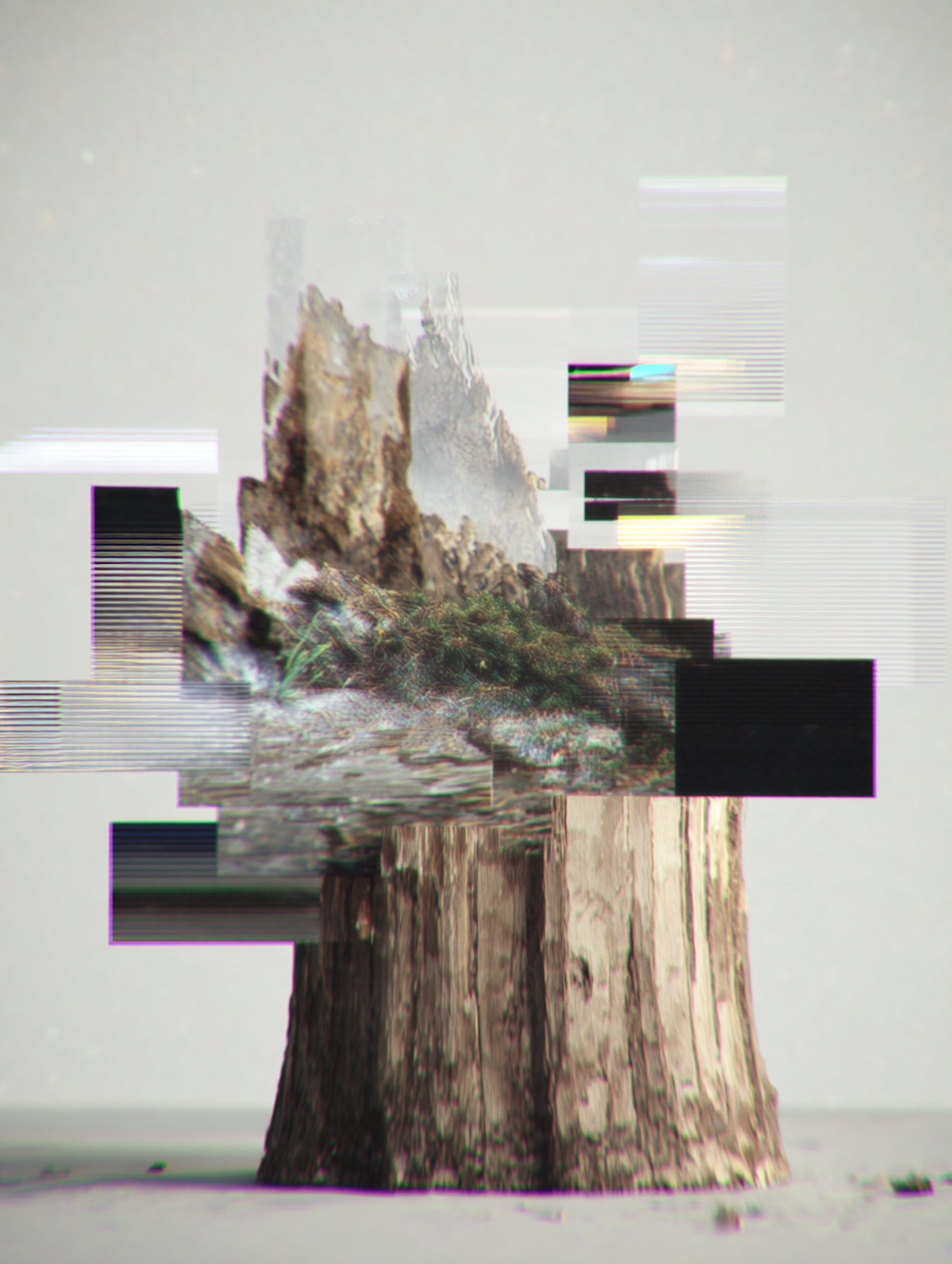 A tree stump with a surreal digital glitch effect overlaying a rocky landscape and greenery, creating a striking visual contrast.