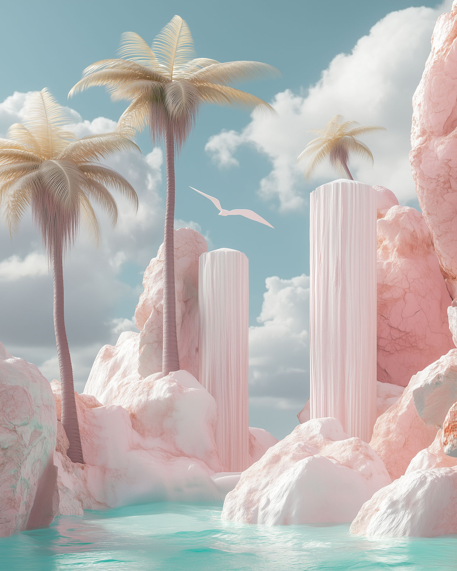 Dreamy pastel landscape with pink rocks, cascading waterfalls, turquoise water, golden palm trees, and a white bird in a serene sky.