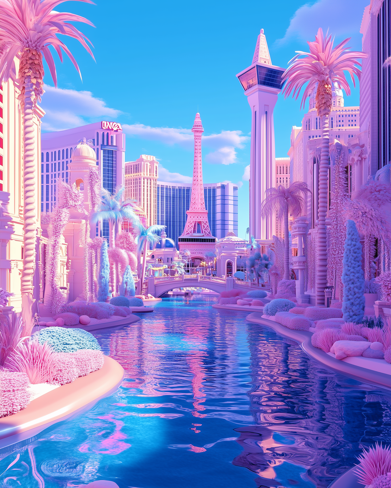 Dreamy pastel Las Vegas-inspired cityscape with canals, iconic landmarks, and vibrant pink and blue tones.