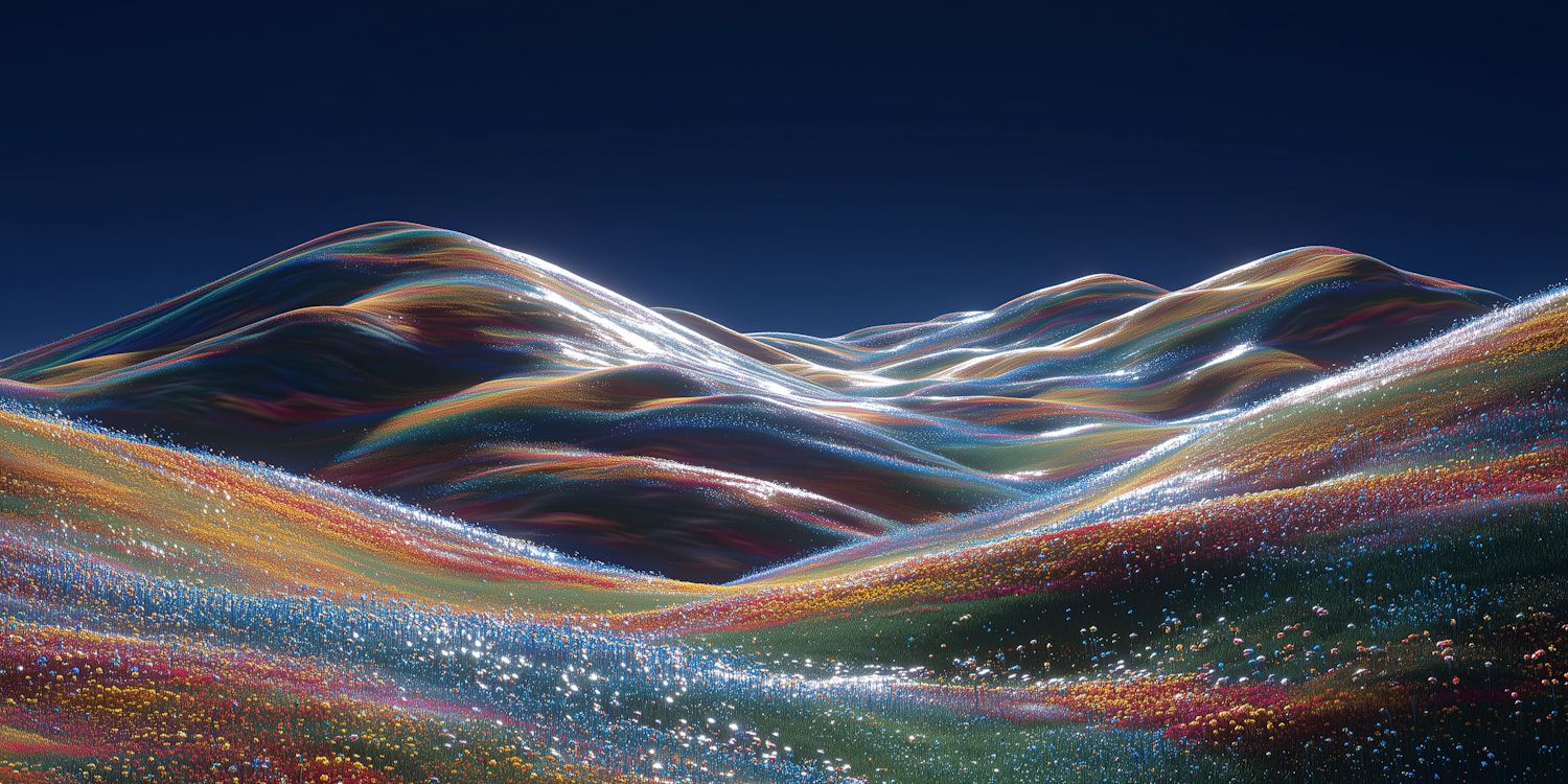 A surreal landscape of glowing, multicolored hills under a deep blue sky, resembling a dreamlike, fantastical terrain.