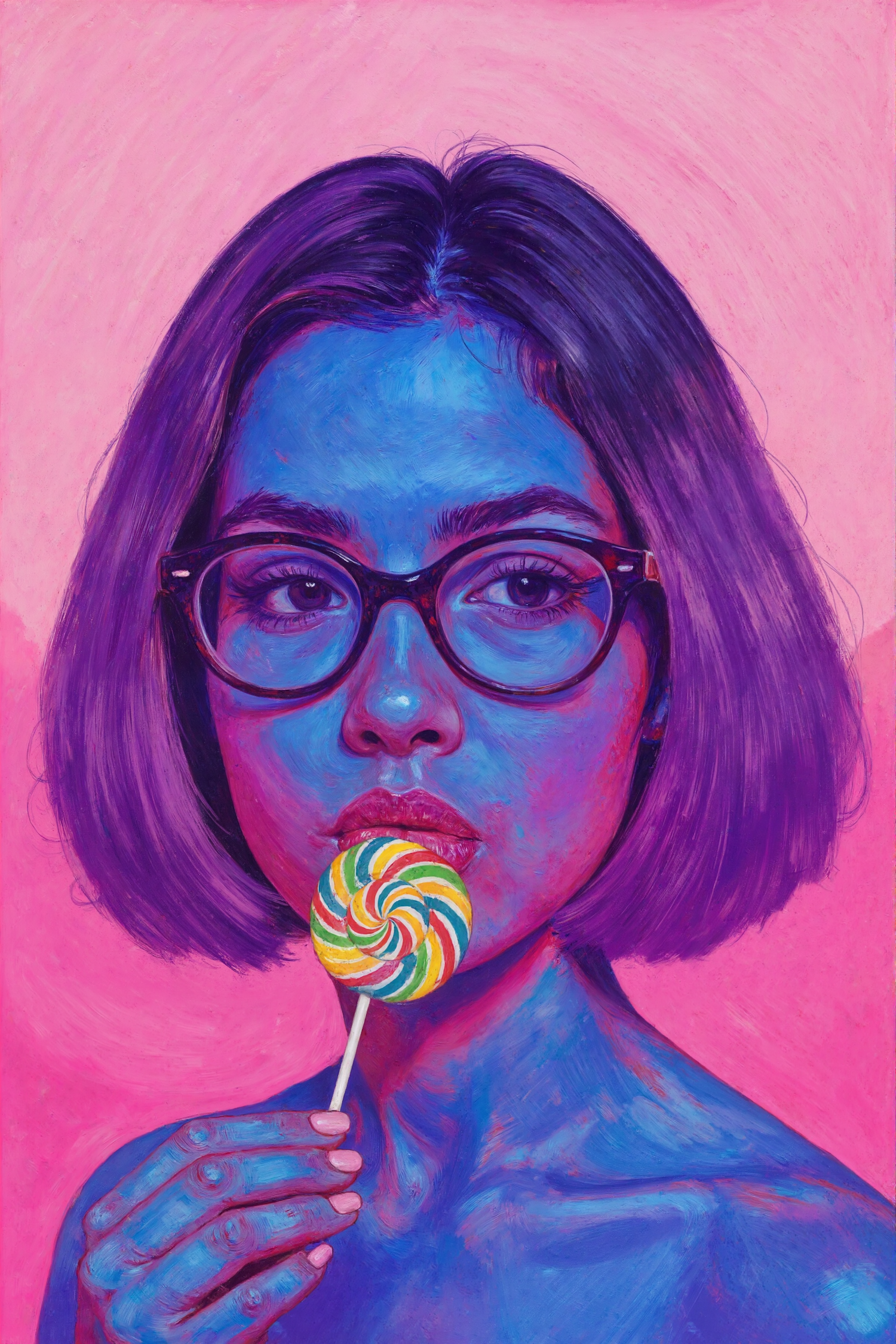 Surreal illustration of a woman with blue skin, purple hair, and glasses holding a colorful lollipop against a bright pink background.