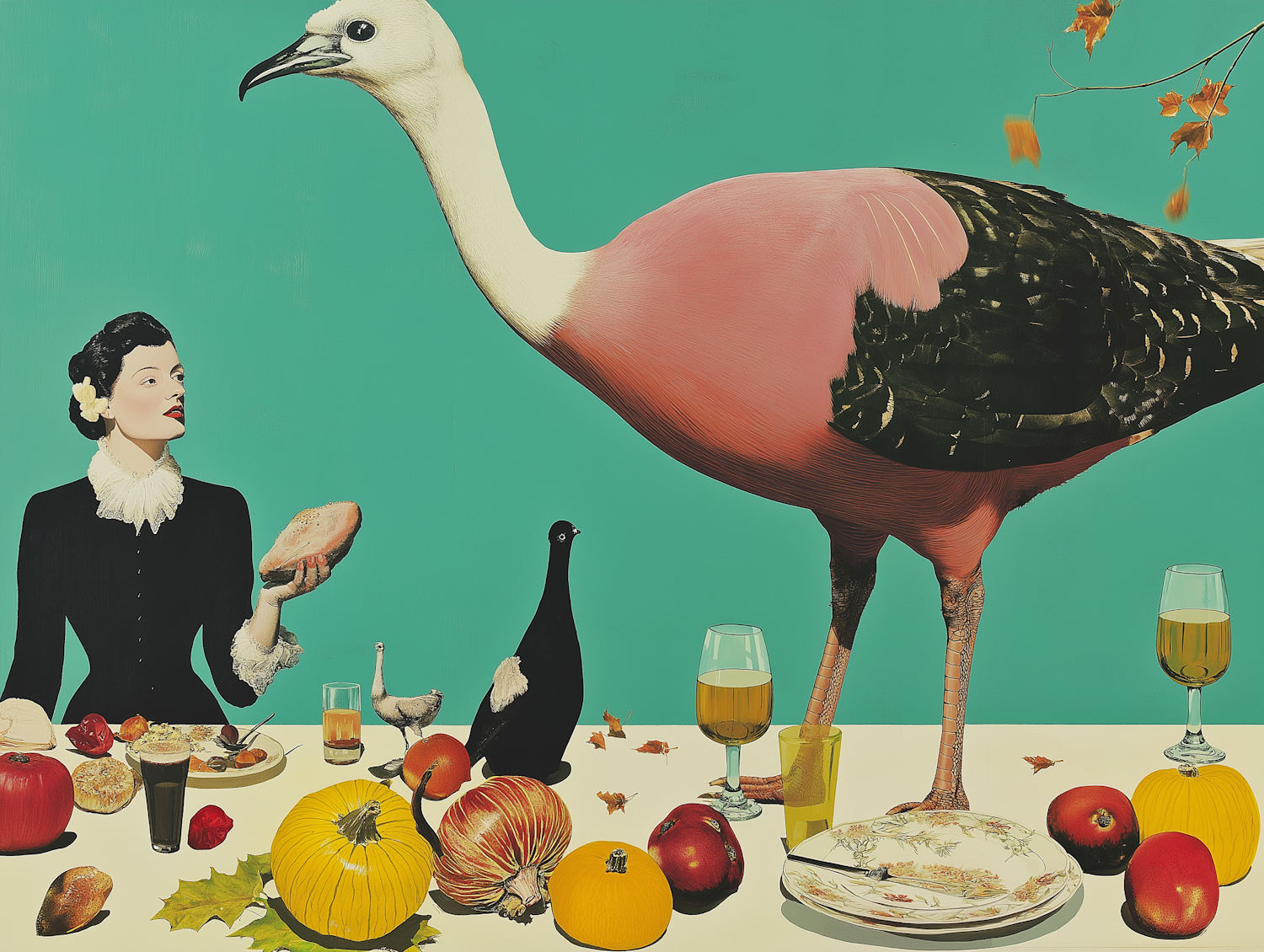 Surreal illustration of a woman dining with oversized birds, surrounded by pumpkins and fruits on a teal background.
