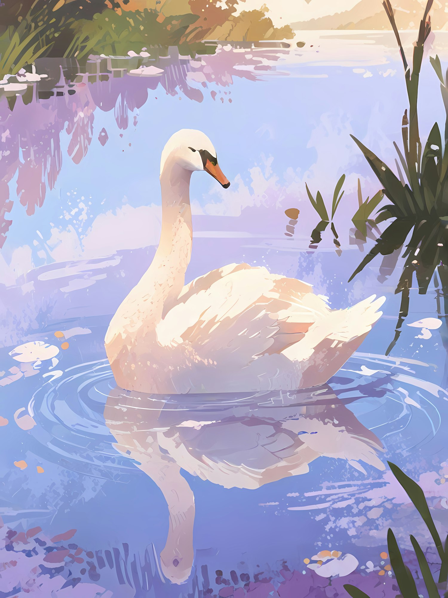 A peaceful swan gliding on a calm lake, surrounded by reeds and soft reflections in a painterly, nature-inspired illustration.
