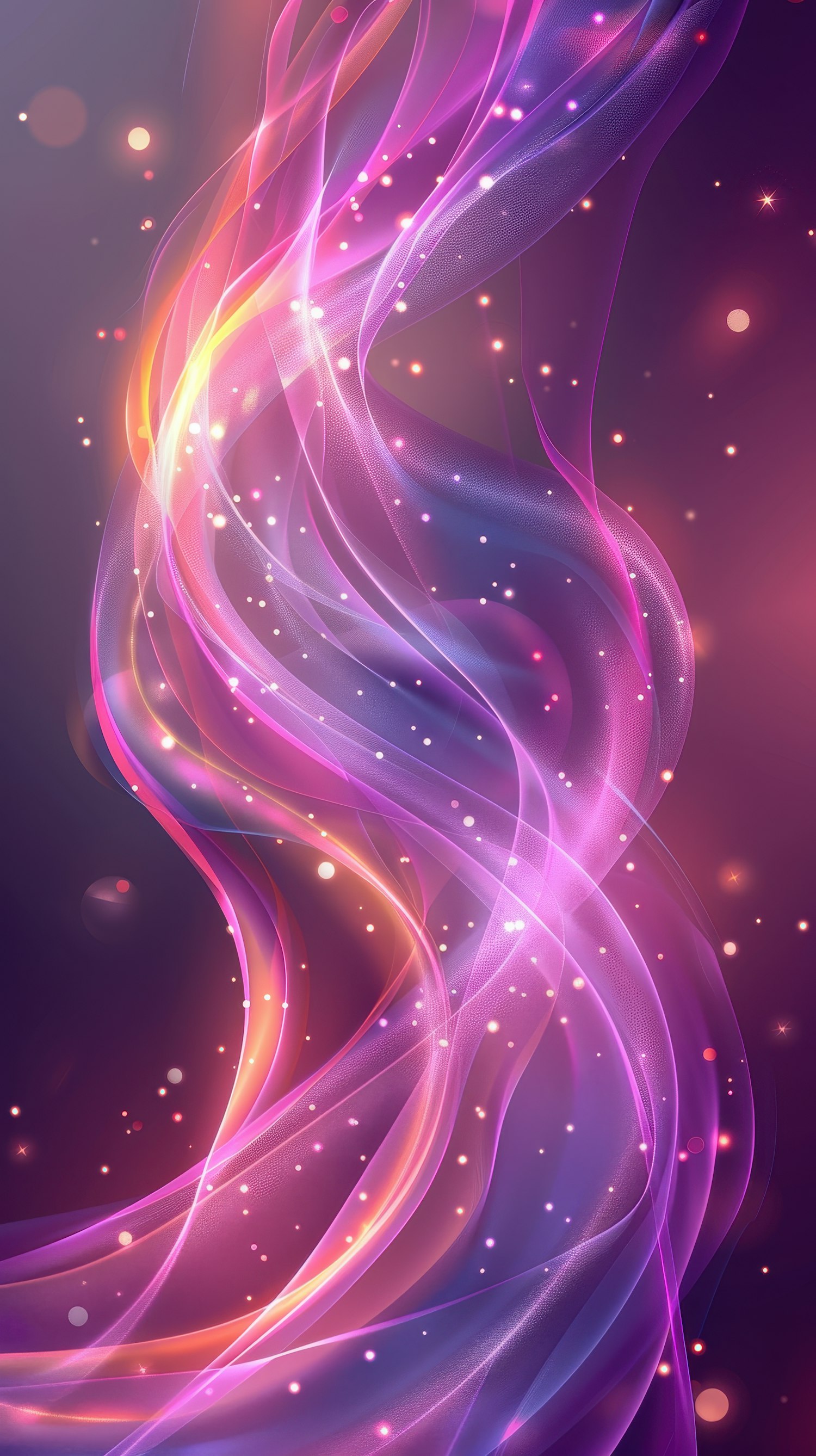 Vibrant abstract digital art with swirling pink, purple, and orange ribbons and glowing particles on a deep purple background.