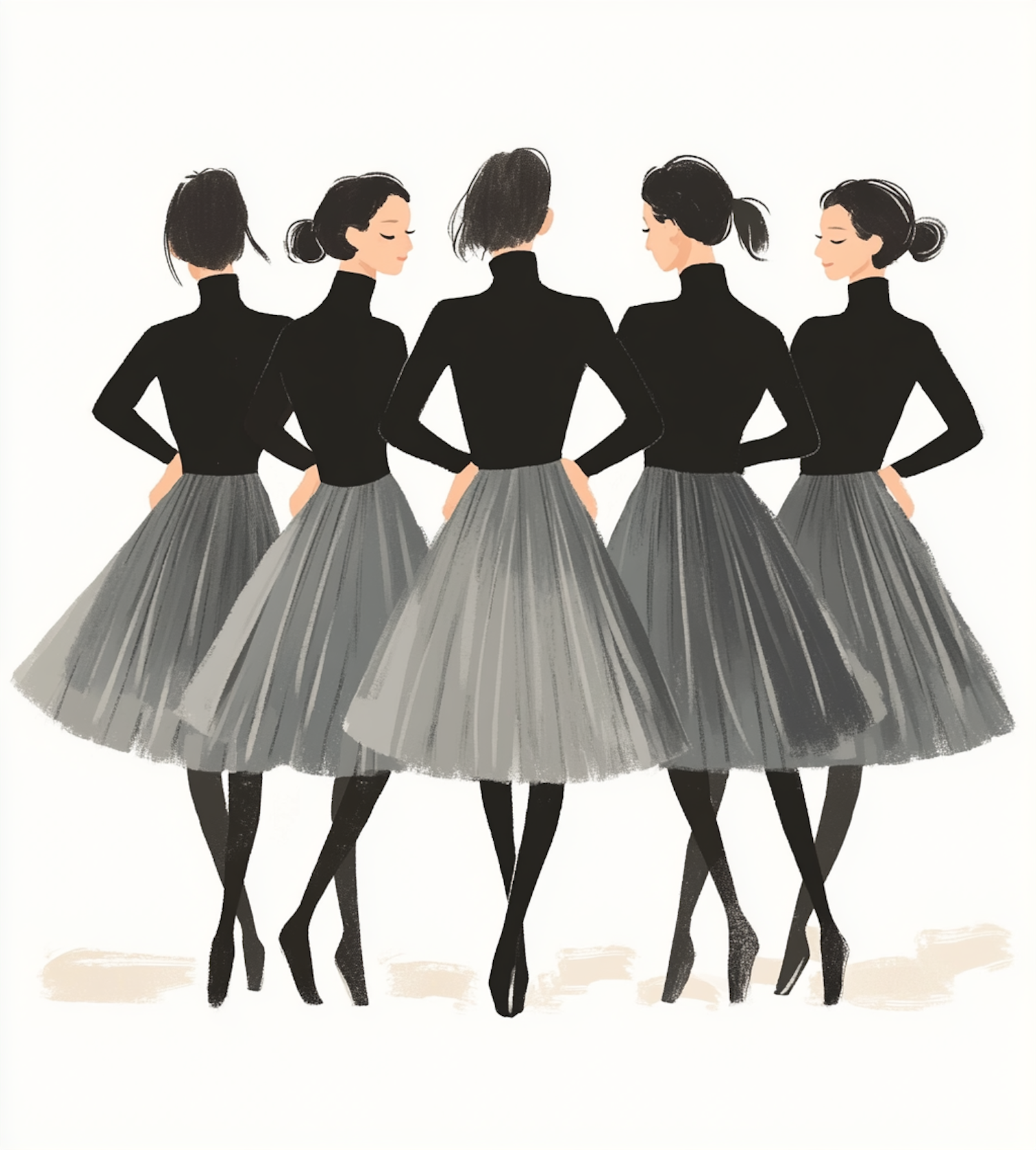 Elegant illustration of five women in black turtlenecks and gray skirts, standing gracefully with hands on hips.