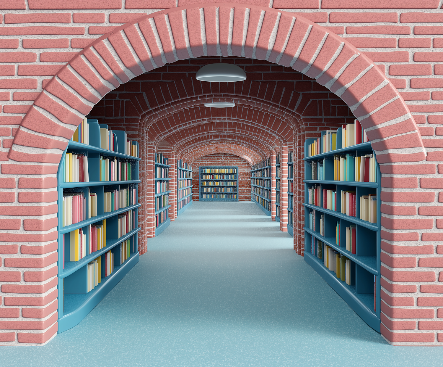 A library corridor with brick arches and blue bookshelves filled with colorful books, creating a tunnel-like effect.