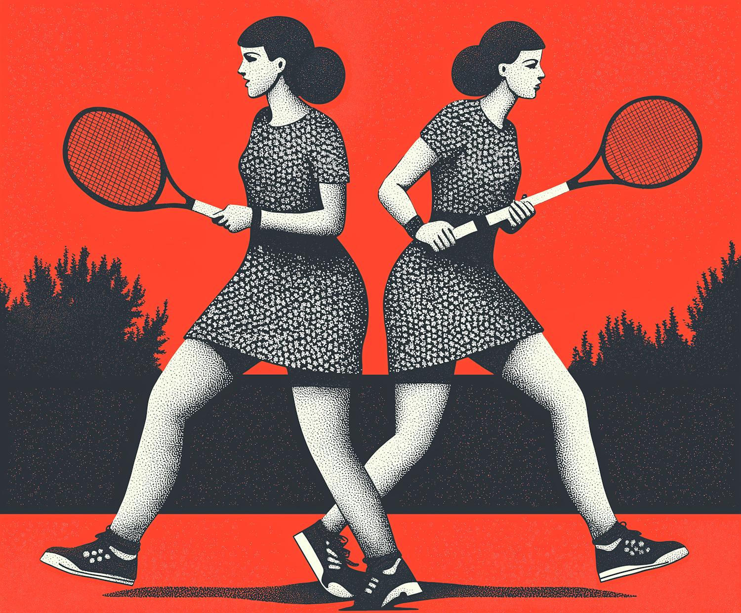 Stylized illustration of two women with tennis rackets on a bold red background, creating a mirrored effect with vintage textures.