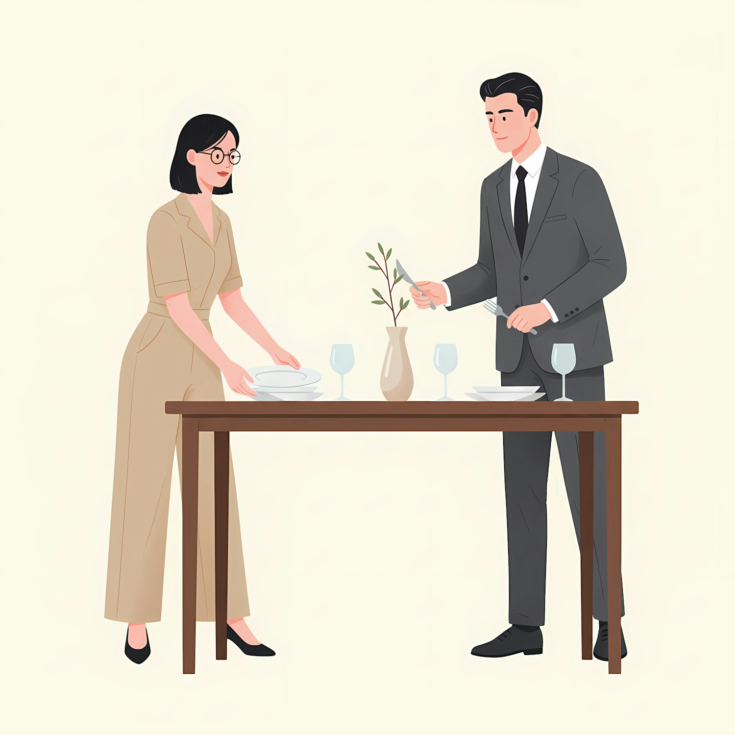 A man in a suit and a woman in a beige jumpsuit set a table with plates, glasses, and a vase, creating a simple and elegant dining setup.
